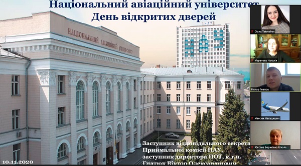 10 листопада 2020 року майбутні абітурієнти Національного авіаційного університету взяли участь в онлайн-зустрічі ‑ Дні відкритих дверей. Серед учасників ‑ учні старших класів, училищ, студенти коледжів, батьки, науковці університету, представники Приймальної комісії НАУ.
