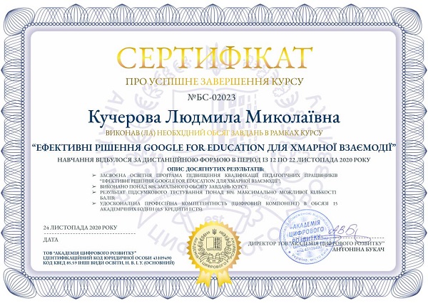 Вітаємо всіх учасників курсу «Ефективні рішення Google for Education для хмарної взаємодії» із успішним завершенням та отриманням сертифікатів про підвищення кваліфікації!