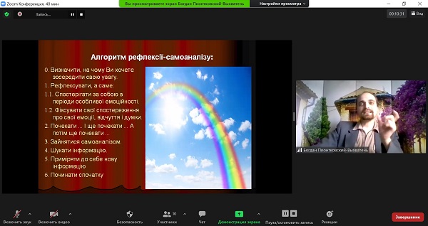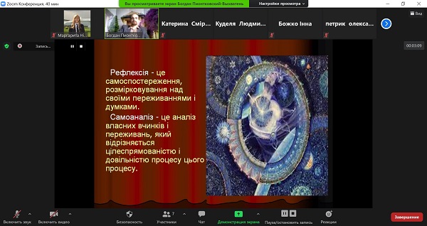 На проведеному вебінарі ми розглянули теоретико-практичний аспект самоаналізу та рефлексії. Самоаналіз – вивчення людини самого себе, свого внутрішнього світу і глибин своєї психіки, як би «погляд з середини». Суб'єкт самоаналізу, тобто учень, або дорослий, аналізує свою діяльність і свої дії на уроці. Завданням самоаналізу є виявлення особливостей власної навчальної діяльності, виявлення успішно застосованих методів навчання, фіксація отриманих результатів, встановлення їх відповідності поставленим цілям і ситуаціям. Самоаналіз необхідний для переходу до оцінки власної діяльності, її коригуванні в подальшому, плануванні кроків самовдосконалення. Рефлексія й самоаналіз ці два процеси йдуть поруч. Рефлексія – самоспостереження, роздум над своїми переживаннями і думками. Це щось нове, до чого прагне сучасна педагогіка: вчити не науці, а вчити вчитися. Рефлексія допомагає дитині не тільки усвідомити пройдений шлях, а й вибудувати логічний ланцюжок, систематизувати отриманий досвід.