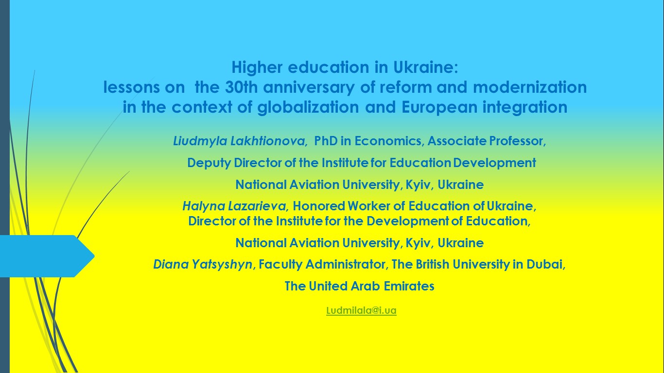 На пленарному засіданні конференції із спільною доповіддю «Higher education in Ukraine: lessons on the 30th anniversary of reform and modernization in the context of globalization and European integration » (Вища освіта в Україні: уроки реформування та модернізації в умовах глобалізації та Євроінтеграції») виступили Галина Лазарєва, директор Інститут розвитку освіти, заслужений працівник освіти України; Людмила Лахтіонова, заступник директора Інститут розвитку освіти, кандидат економічних наук, доцент; Діана Яцишин, Британський університет в Дубаї, ОАЕ.