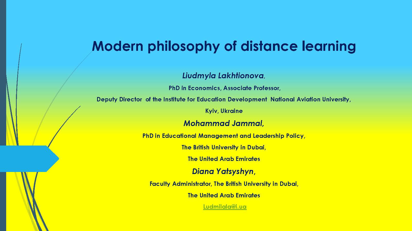 З науковою доповіддю «Modern philosophy of distance learning» («Сучасна філософія дистанційного навчання») виступила Людмила Лахтіонова, заступник директора Інститут розвитку освіти, кандидат економічних наук, доцент (співавтори: Мохаммад Джаммаль, Британський університет в Дубаї, ОАЕ, кандидат наук з менеджменту освіти та політики лідерства; Діана Яцишин, адміністратор факультету, Британський університет в Дубаї, ОАЕ).