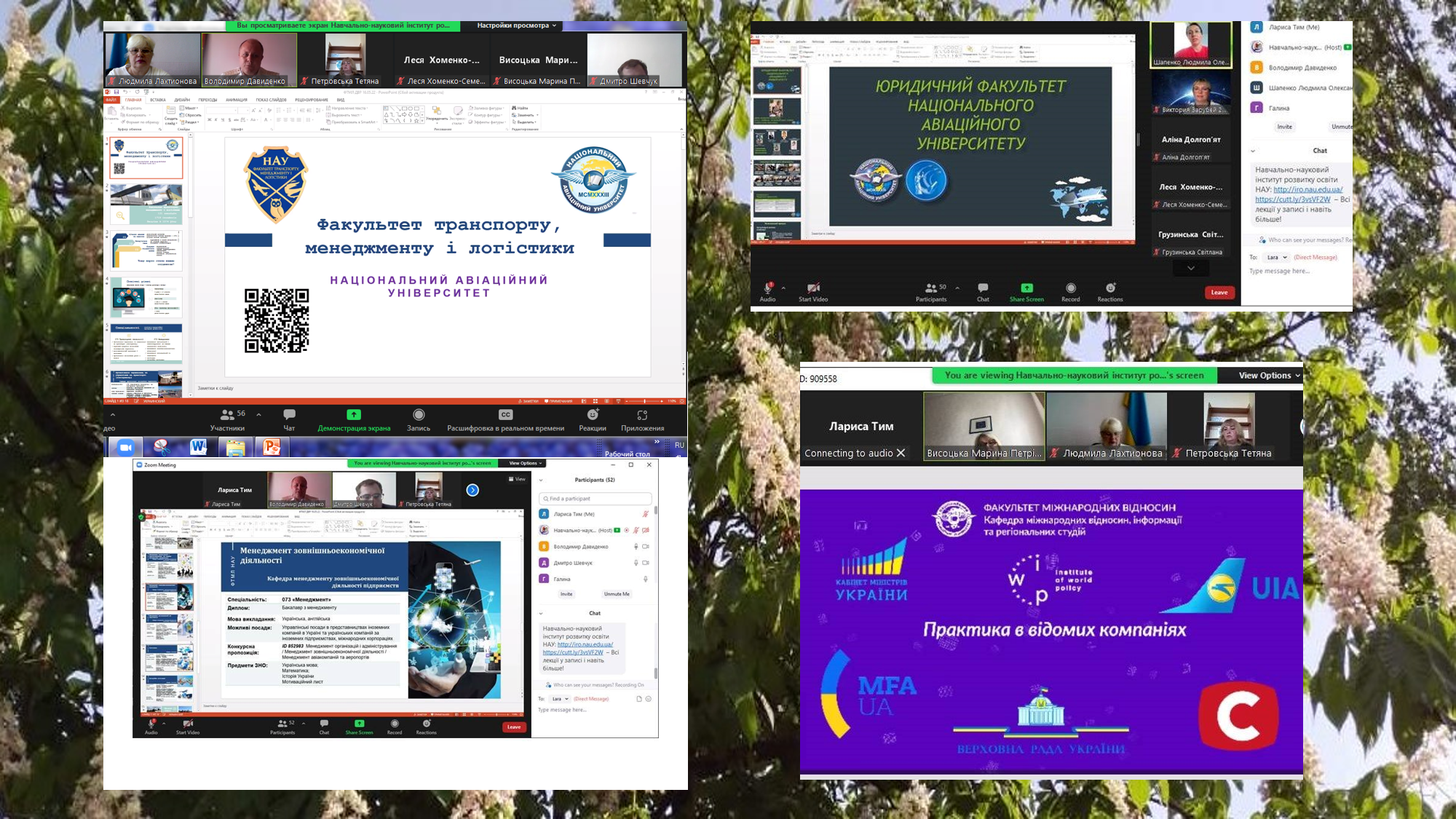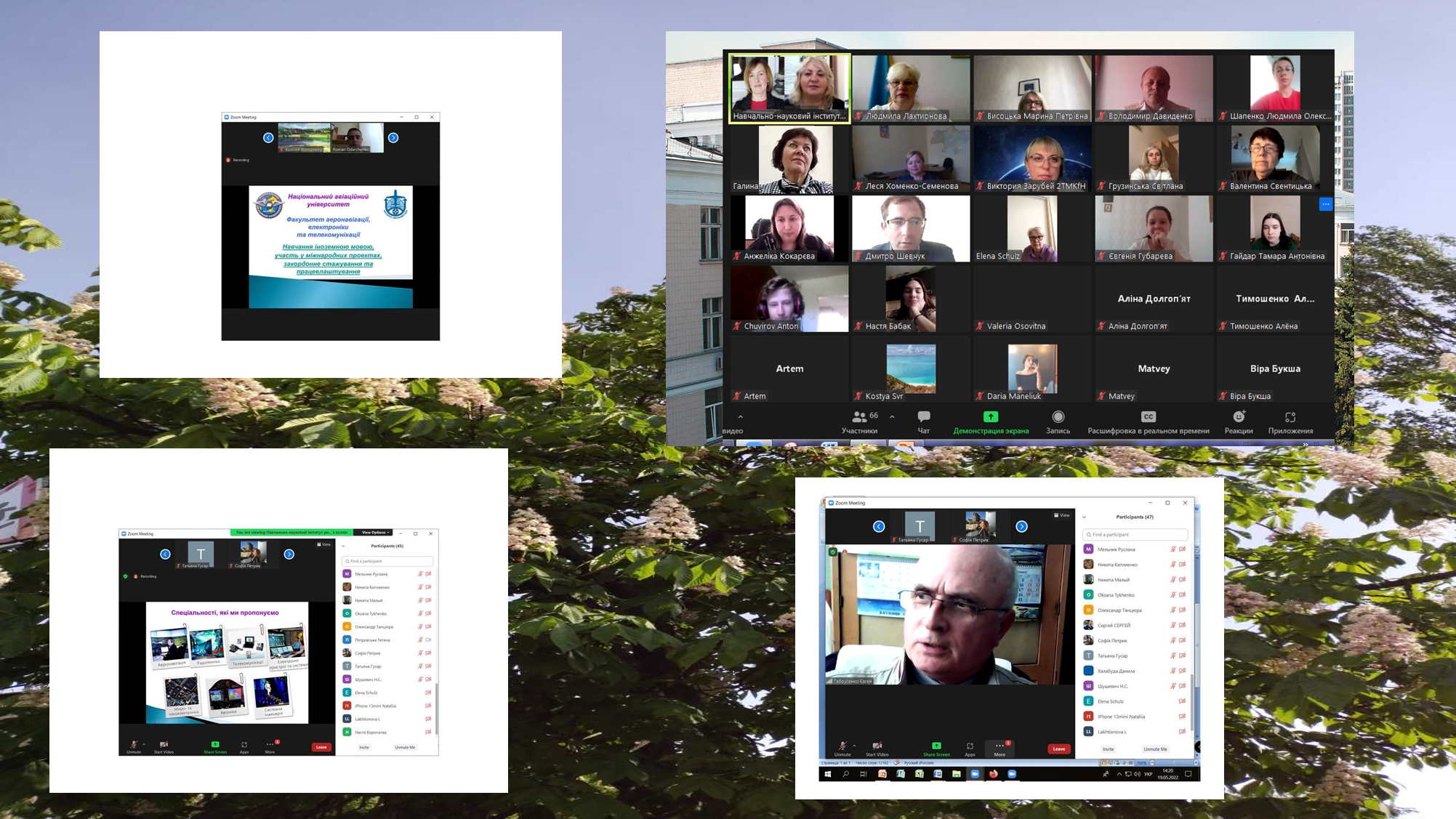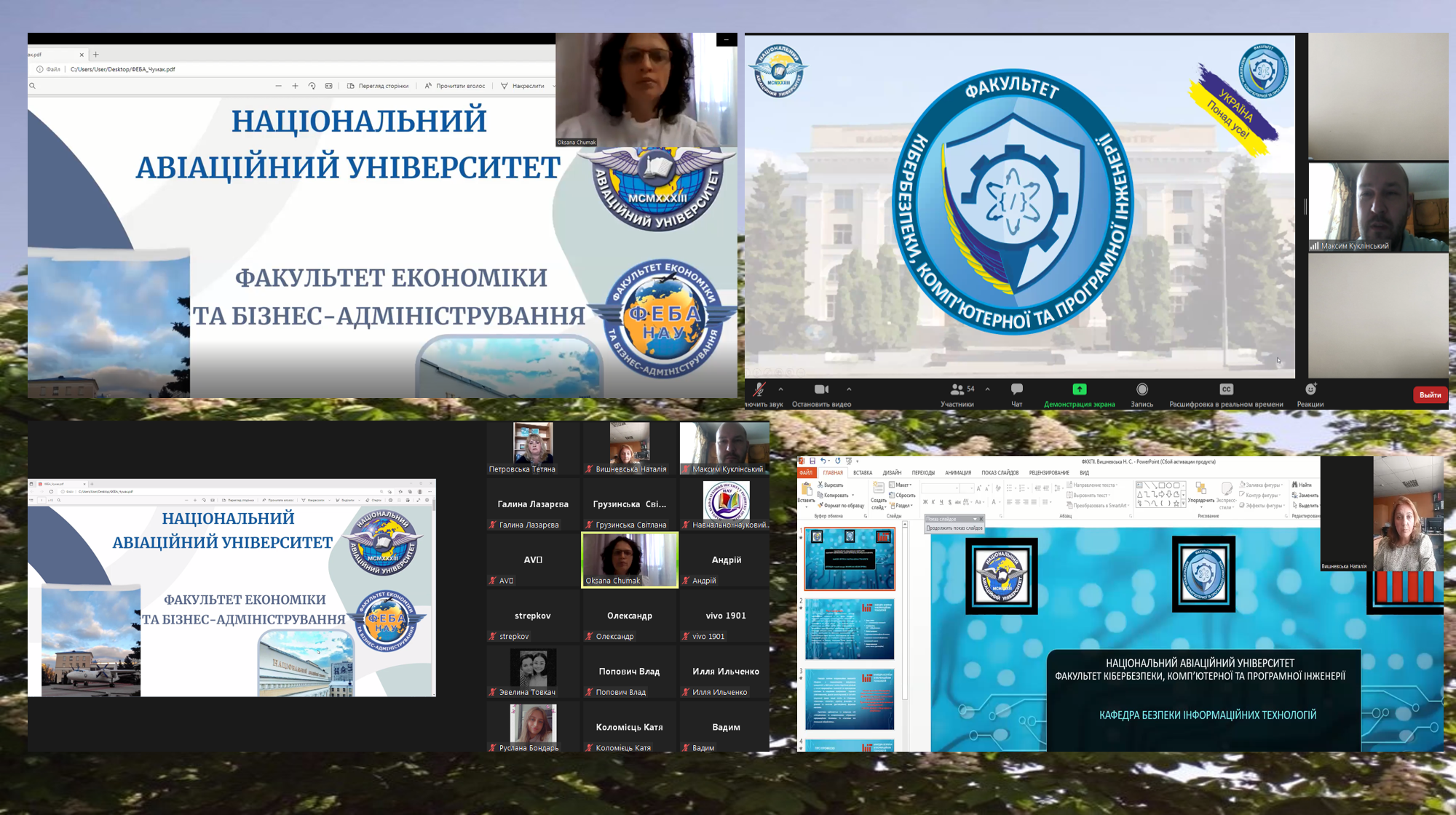 Спікери заходів-онлайн – Висоцька Марина, к.екон.н., заступник декана Факультету міжнародних відносин, доцент; Хоменко-Семенова Леся, к.пед.н., доцент кафедри педагогіки та психології професійної освіти Факультету лінгвістики та соціальних комунікацій, доцент; Давиденко Володимир, к.екон.н., відповідальний секретар Факультету транспорту, менеджменту і логістики, доцент кафедри логістики; Шевчук Дмитро, д.т.н., завідувач кафедри організації авіаційних перевезень ФТМЛ, старший науковий співробітник; Шапенко Людмила, к.ю.н. доцент кафедри конституційного і адміністративного права Юридичного факультету; к.т.н., Завгородній Сергій, декан Факультету аероновігації, електроніки та телекомунікацій; Одарченко Роман, завідувач кафедри телекомунікаційних та радіоелектронних систем ФАЕТ, д.т.н., доцент; Габрусенко Євген, доцент кафедри електроніки, робототехніки і технологій моніторингу та інтернету речей, к.т.н., доцент, координатор профорієнтаційної роботи ФАЕТ; Віктор Бородій, заступник декана АКФ; Грабовчак Валентина, к.т.н., заступник декана з навчально-виховної роботи Факультету архітектури, будівництва та дизайну; Гроза Валентина, к.ф-м.н., заступник декана Факультету екологічної безпеки, інженерії та технологій, доцент; Тихенко Оксана, д.т.н., професор кафедри екології ФЕБІТ, доцент; Куклінський Максим, к.т.н., доцент, заступник декана Факультету кібербезпеки, комп’ютерної і програмної інженерії; Вишневська Наталія, старший викладач кафедри безпеки інформаційних технологій ФККПІ; Чумак Оксана, д.екон.н., доцент, завідувач кафедри економіки та бізнес-технологій Факультету економіки та бізнес-адміністрування; майор Малиш Андрій, викладач, секретар відбіркової комісії Кафедри військової підготовки.