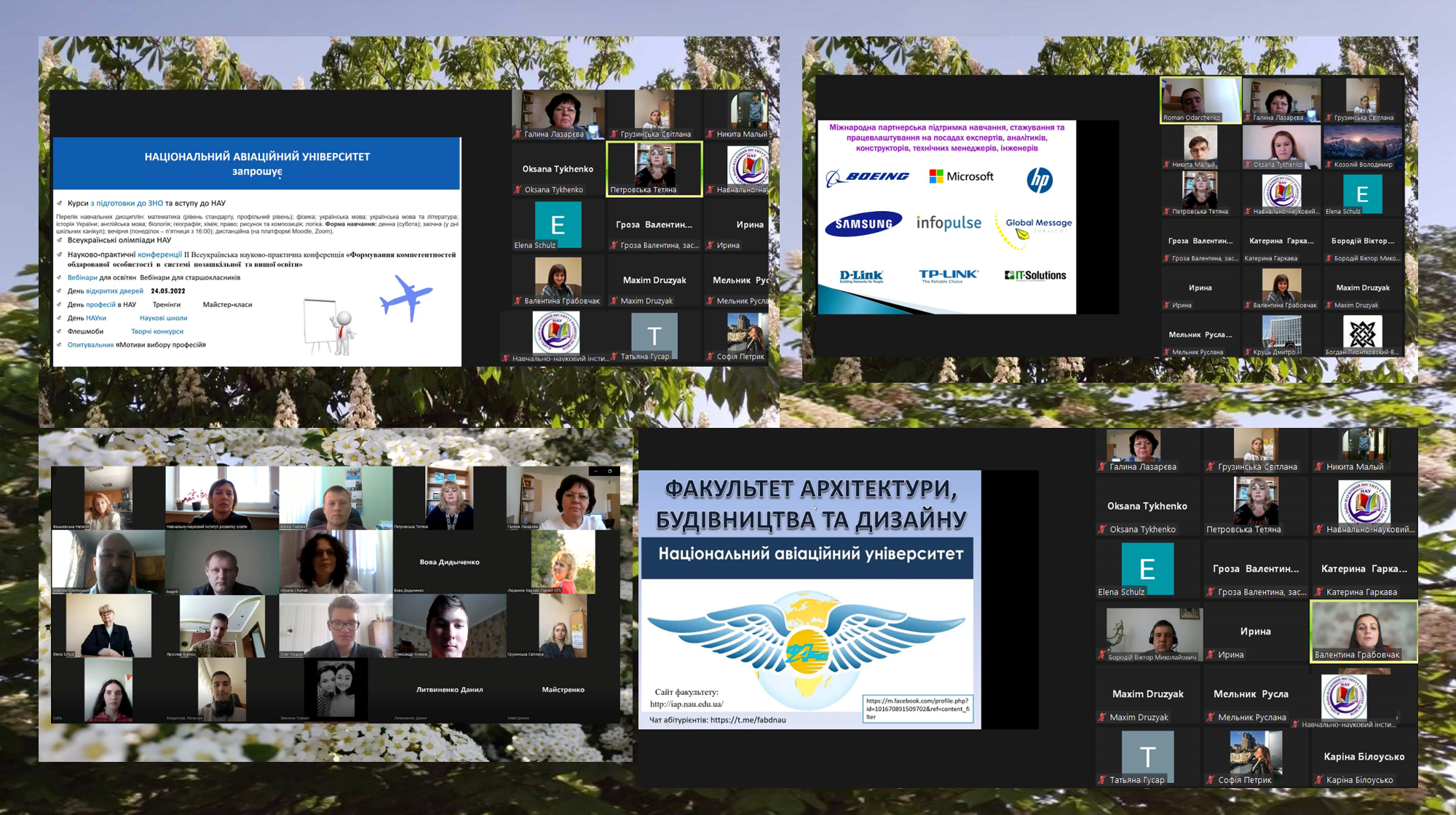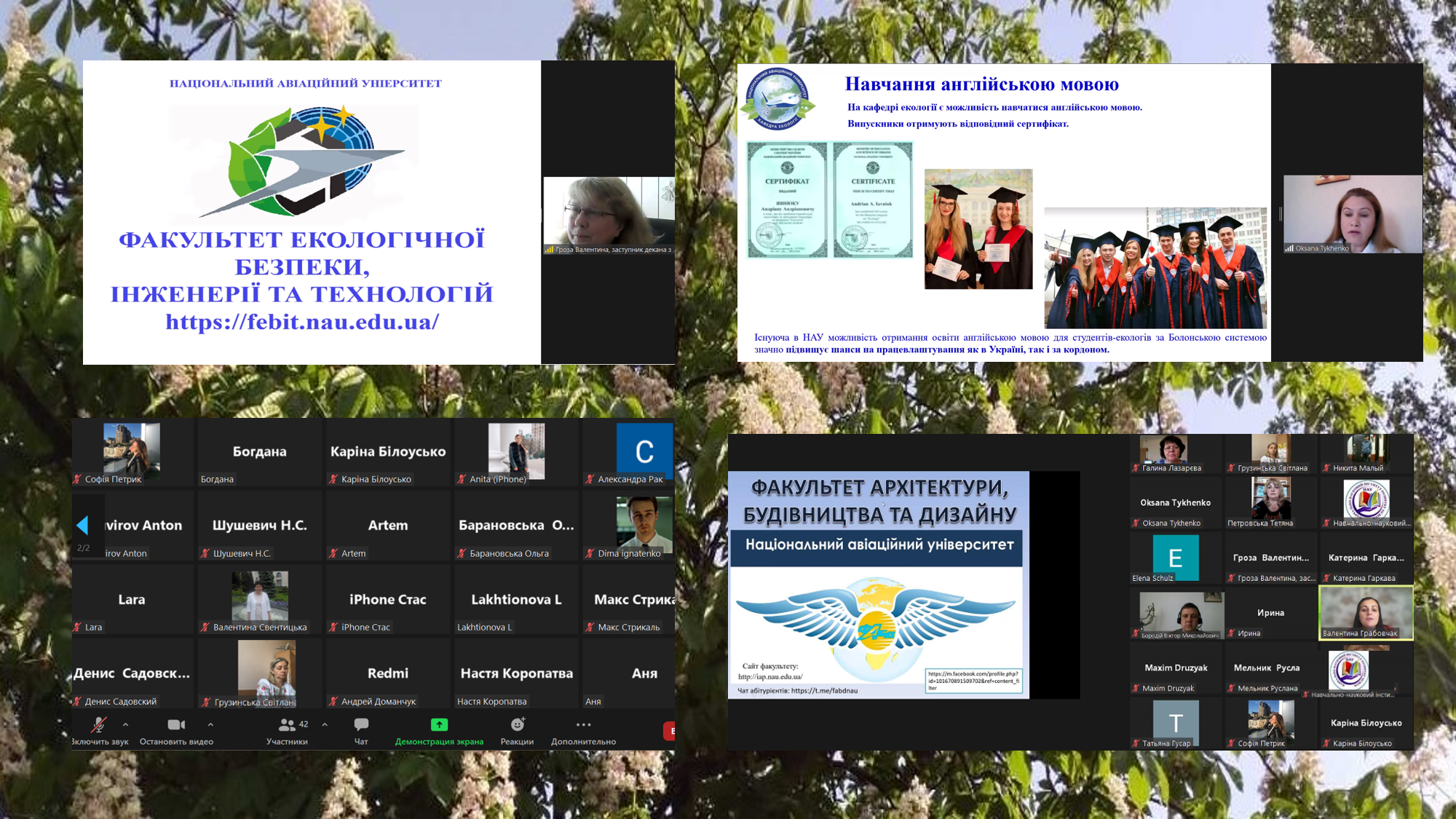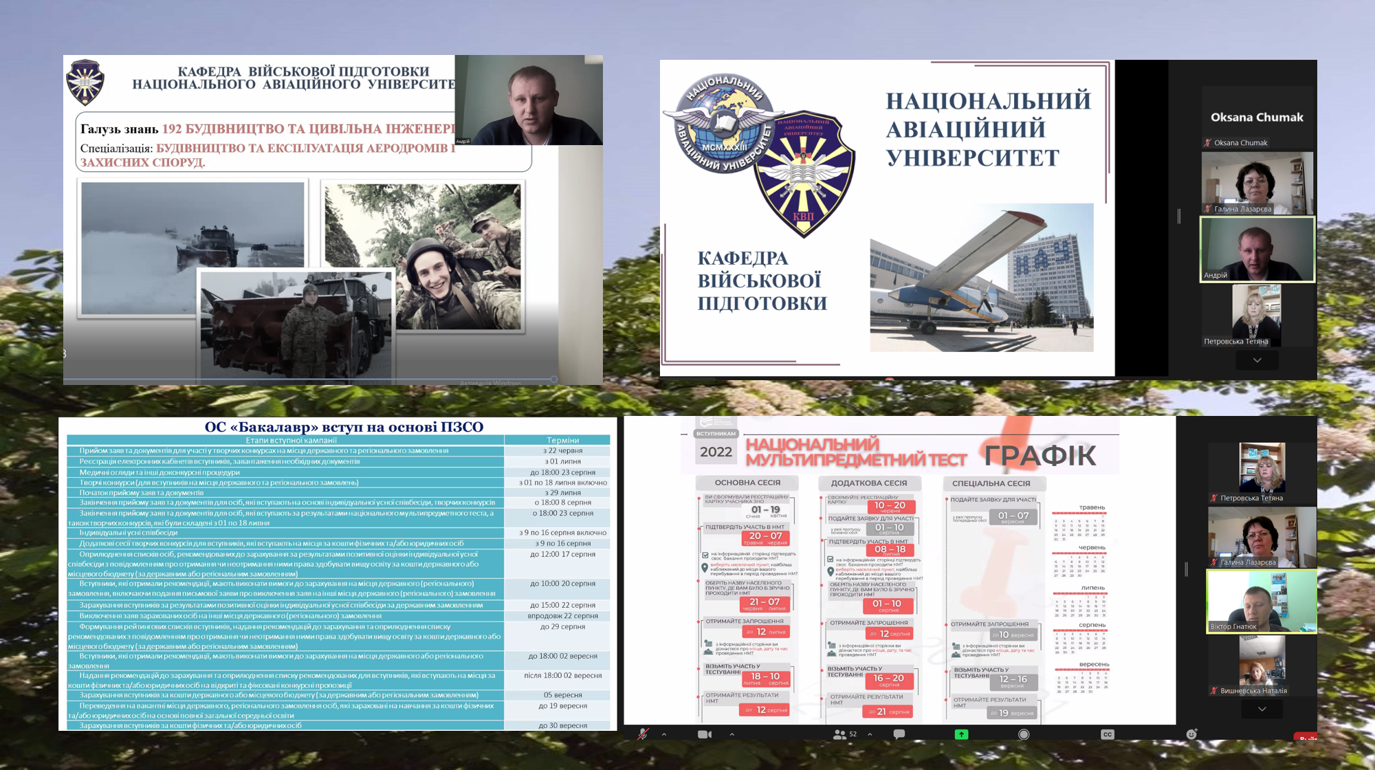 В умовах воєнного часу 17, 19, 24 травня 2022 року в Національному авіаційному університеті відбулися інформаційно-профорієнтаційні заходи «День відкритих дверей» в онлайн-форматі для потенційних абітурієнтів. Учні старших класів закладів загальної середньої освіти та студенти випускних груп коледжів зустрілися з представниками факультетів університету в режимі відеоконференції Zoom.