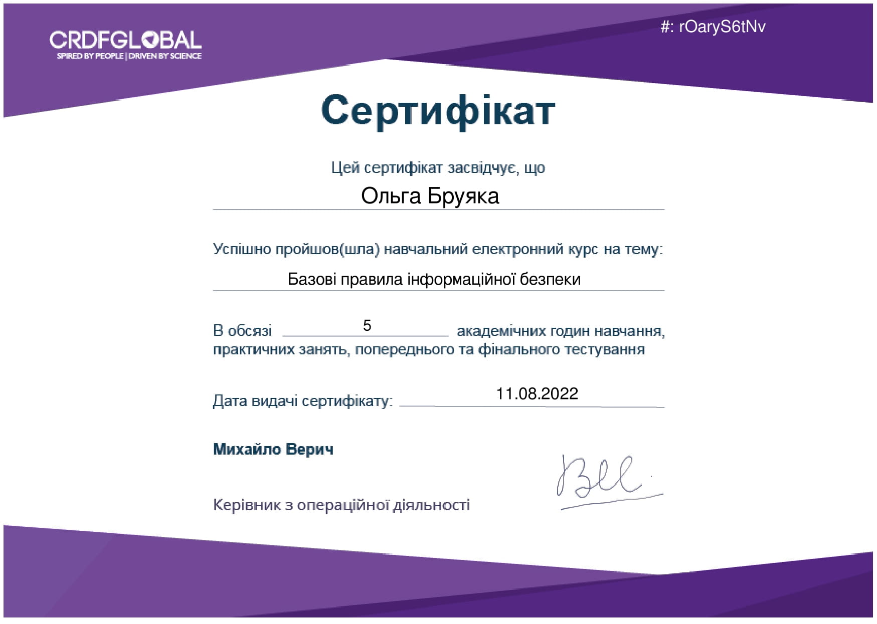 В рамках курсу, за допомогою інтерактивних вправ і практичних завдань, завідувач кафедри базових та спеціальних дисциплін ННІРО, кандидат технічних наук, доцент Ольга БРУЯКА вивчила базові правила захисту інформації на мобільних телефонах, комп’ютерах та у соціальних мережах; навчилася визначати фейкові новини і поширені помилки користувачів в цифровому просторі; дізналася, що потрібно робити для запобігання впливам кібер-шахраїв. За результатами отриманих знань отримала сертифікат.