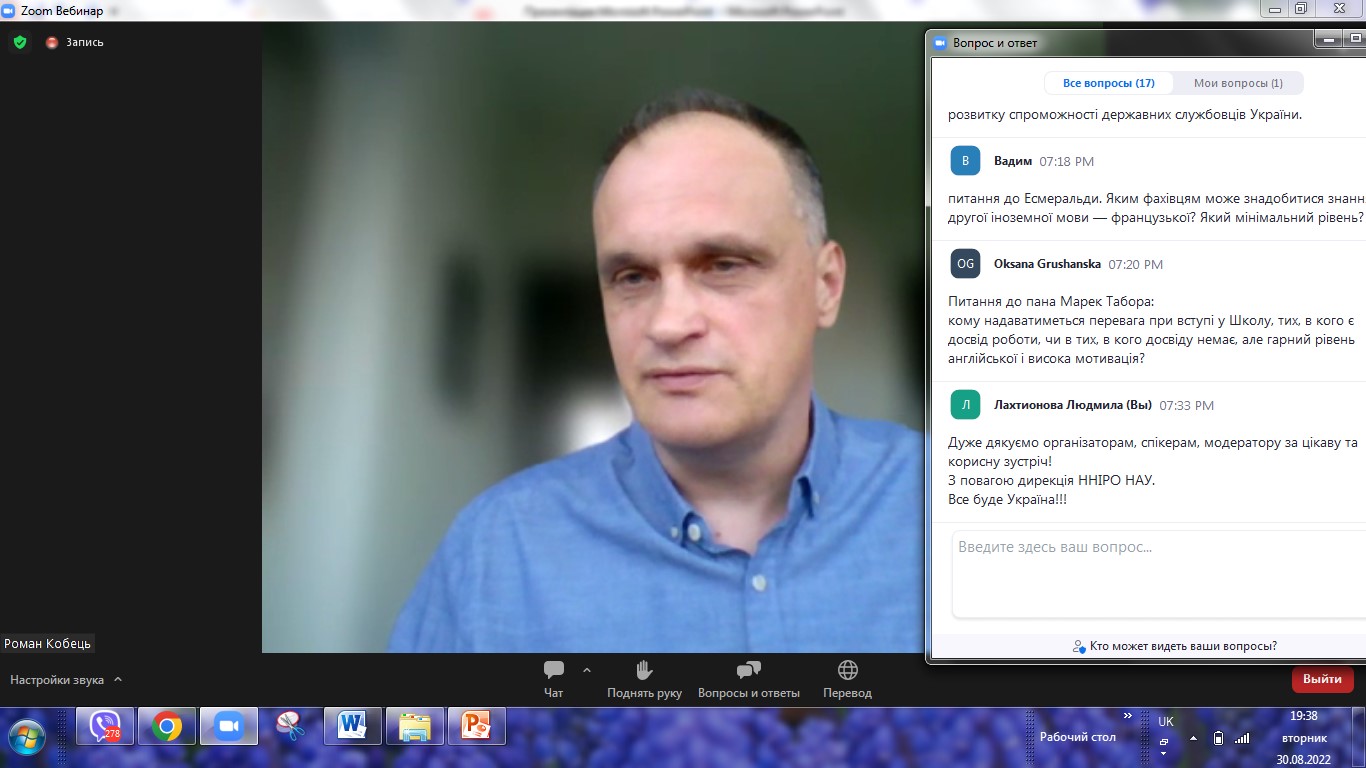 Людмила ЛАХТІОНОВА наживо в ефірі висловила подяку організаторам, спікерам, модератору за цікаву та корисну зустріч. Наголосила, що всі рекомендації, які були отримані за результатами онлайн-діалогу, будуть впроваджені в роботу з кадровим персоналом ННІРО. Мета одна, шлях один, спрямованість одна – до Європейської інтеграції. ВСЕ БУДЕ УКРАЇНА!