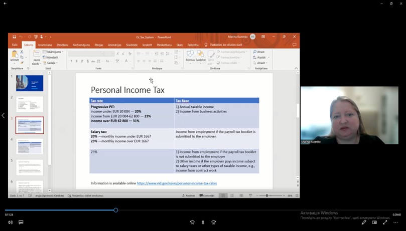 Другу лекцію на тему «Tax System of Latvia» («Податкова система Латвії») прочитала Марина КУЗЕНКО, сертифікований консультант Латвійської асоціації податкових консультантів, член правління SIA Tax Consulting, магістр економіки, Рига, Латвія.