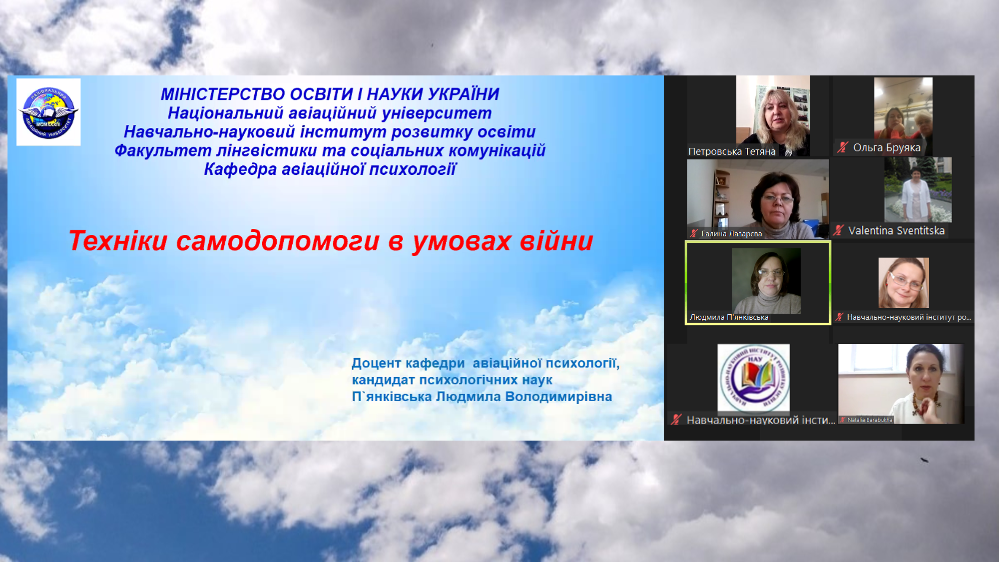Лектор – П’янківська Людмила, доцент кафедри авіаційної психології ФЛСК НАУ, кандидат психологічних наук зауважила, що наразі ми усі переживаємо хронічний стрес, що наступив після травмувальних подій від початку війни. Саме тому робота з нормалізації власного психоемоційного стану є базовою необхідністю кожного. Людмила Володимирівна розповіла та разом із слухачами провела базові техніки самодопомоги під час війни. https://www.youtube.com/watch?v=YvOzYx9fbEo