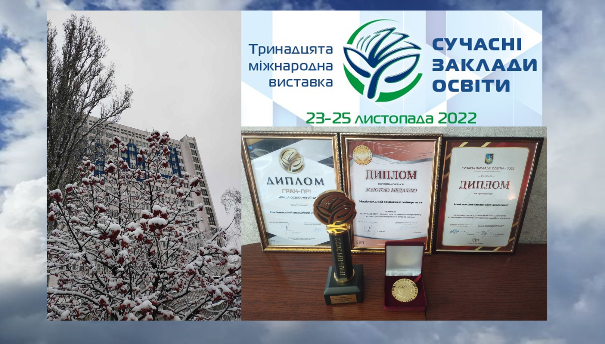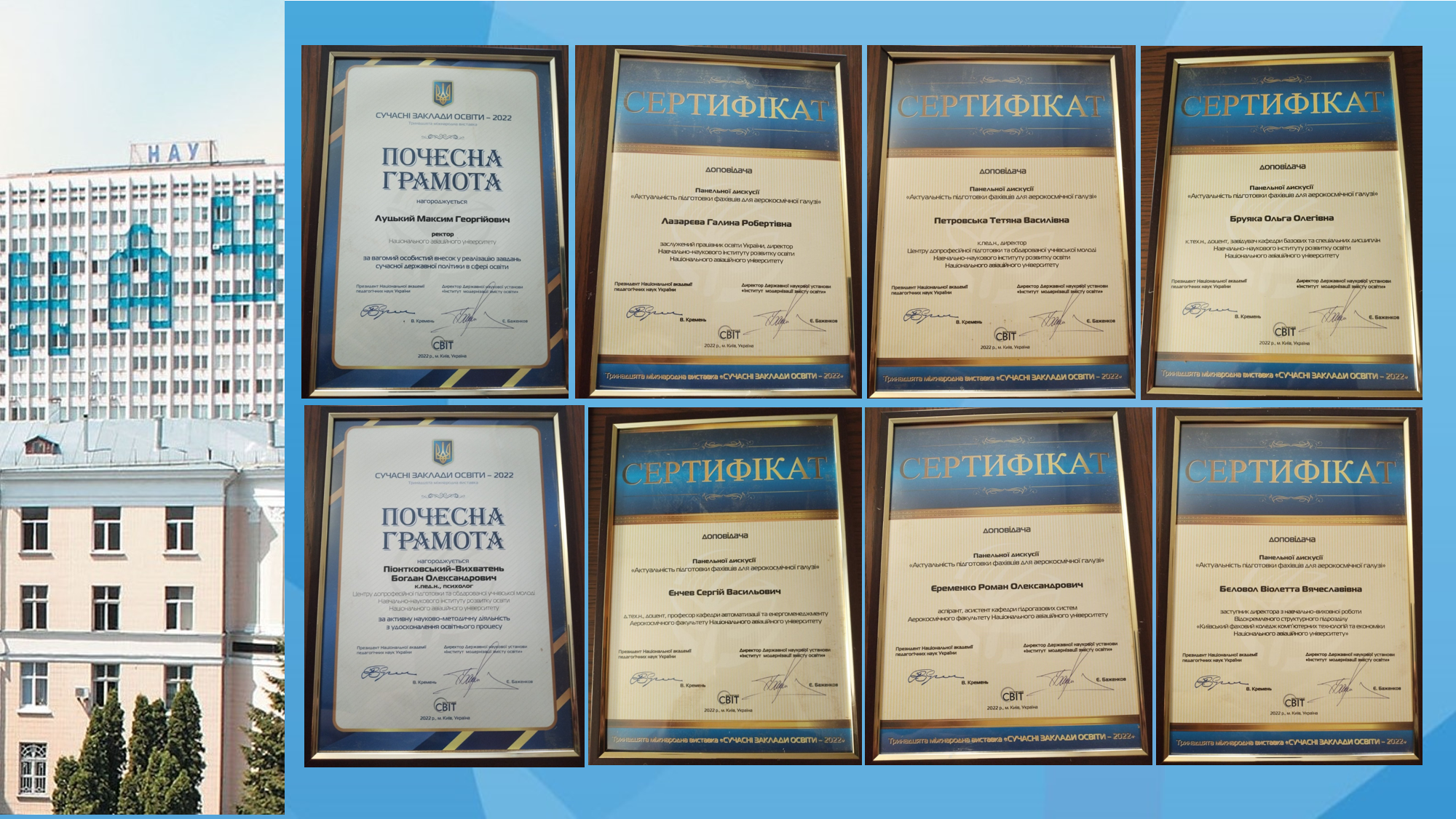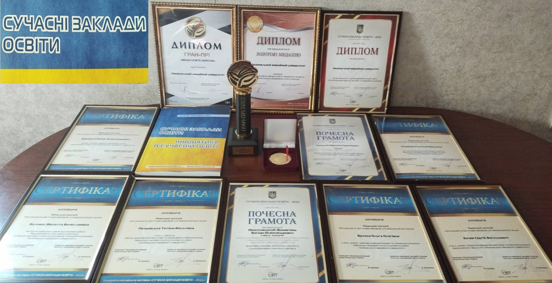 У конкурсах XIII міжнародної виставки «Сучасні заклади освіти» Національний авіаційний університет відзначено Гран-Прі «Вища освіта України» у рейтинговому виставковому конкурсі; нагороджено Дипломом за активну участь у розбудові національної освіти й популяризацію освітніх, наукових і інноваційних досягнень; нагороджено Золотою медаллю у номінації «Система роботи закладу освіти з виявлення і розвитку інтелектуально обдарованих дітей та молоді». Виставка проходила в онлайн режимі 23-25 листопада 2022 року, використовуючи новітні технології.