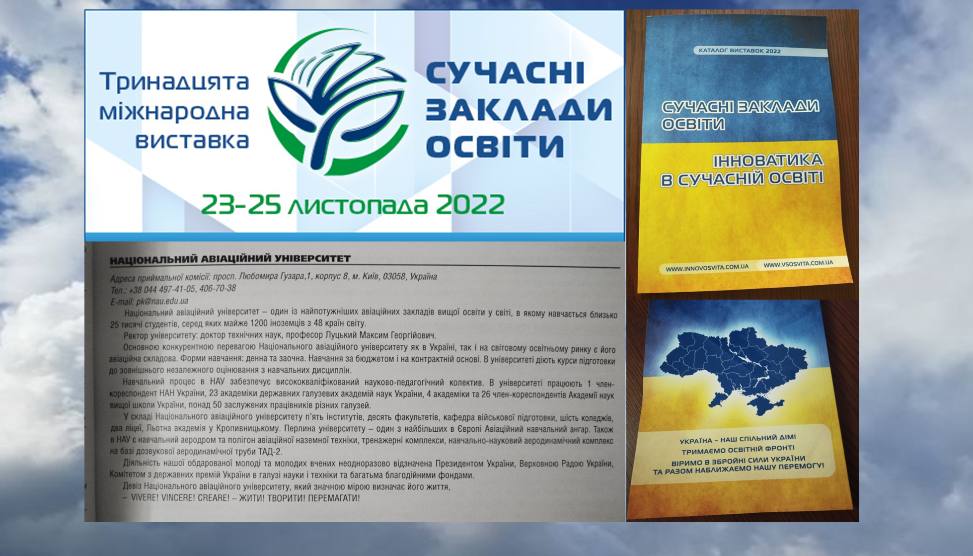 Віртуальна виставка в умовах воєнних дій сприяла обміну досвідом, професійному спілкуванню, новим знанням заради світлого майбутнього українського народу та об’єднала науковців, освітян, учнів старших класів та студентів. Запрошуємо майбутніх абітурієнтів – 2023 року до вступу в НАУ!