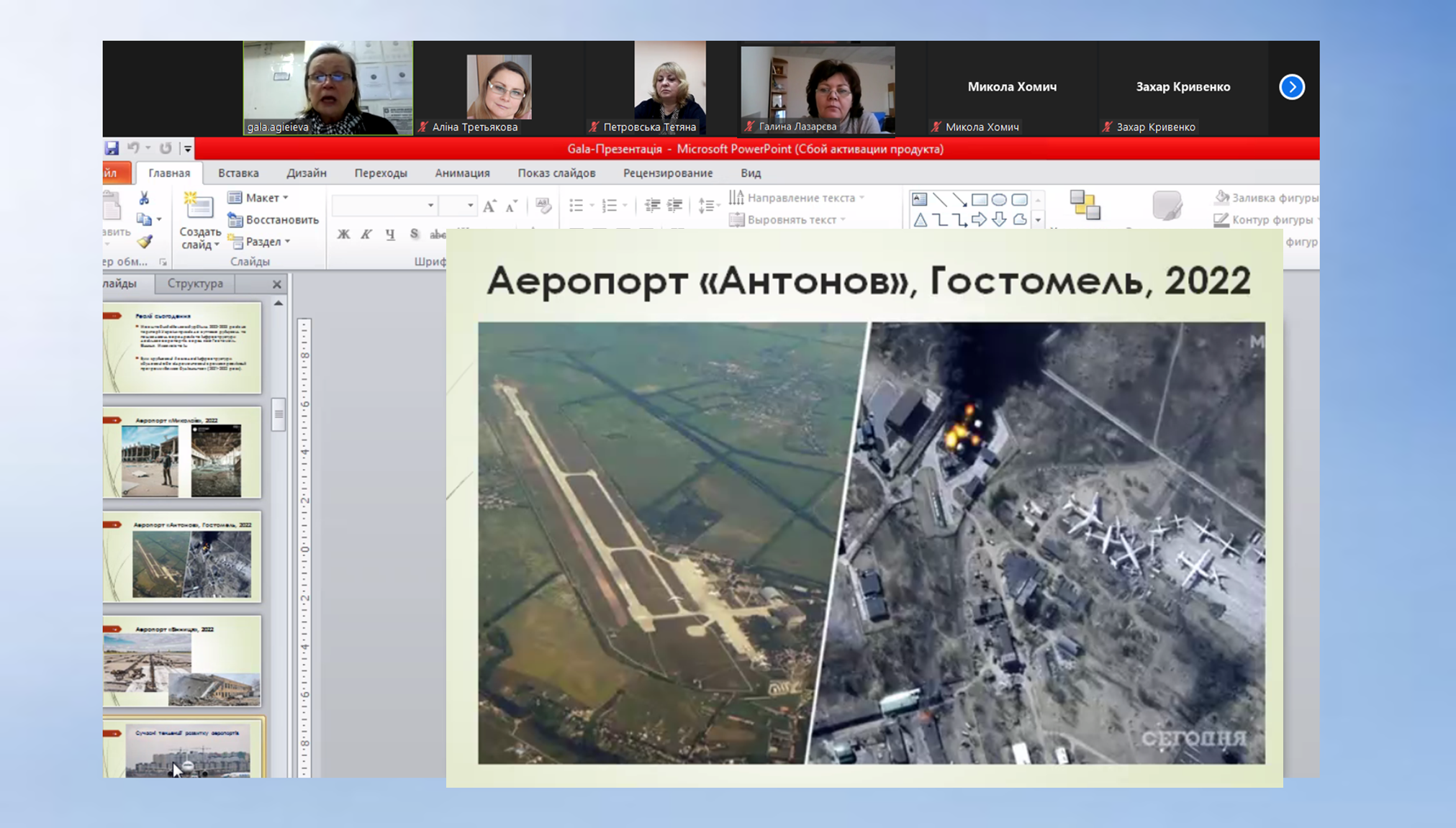 Лектор – Агєєва Галина Миколаївна, доцент кафедри комп’ютерних технологій будівництва та реконструкції аеропортів ФАБД НАУ, кандидат технічних наук, старший науковий співробітник, дійсний член Академії будівництва України зауважила, що нагальні проблеми відбудови та відновлення інфраструктури авіаційного транспорту потребують вивчення світових та вітчизняних практик, зокрема, повоєнних періодів, стосовно створення та удосконалення систем забезпечення надійності та безпеки об’єктів різного призначення; визначення експлуатаційної придатності складових аеродромних та аеропортових комплексів; організації навчального процесу та підготовки відповідних фахівців для авіаційної галузі закладами вищої освіти, зокрема Національним авіаційним університетом (НАУ), створеним у 1933 році.