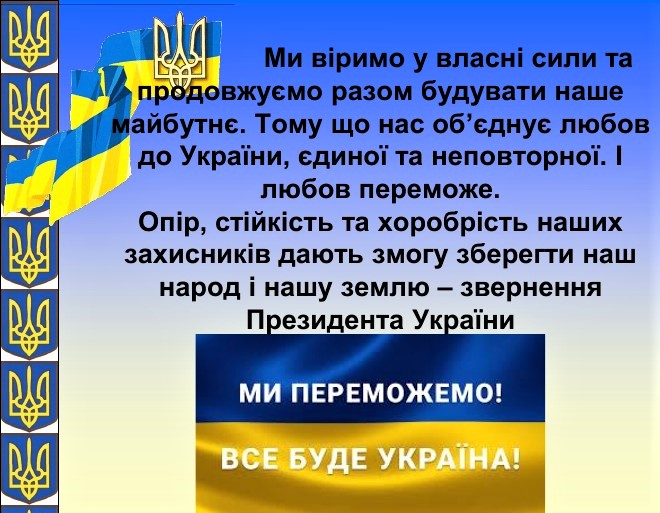 За рік війни з’явилися нові символи незламності – героїчний Маріуполь, нездоланний Харків, згорьована Буча, відважний Чернігів, нескорений Азовсталь, стійкий Херсон, знаменита Чорнобаївка, а ще – Маріуполь, Суми, Гостомель, Волноваха, Охтирка, Макарів, Конотоп, Миколаїв, Бровари, Ізюм та багато інших міст та сіл, які довели усьому світу, що російські окупанти не будуть панувати на українській землі.