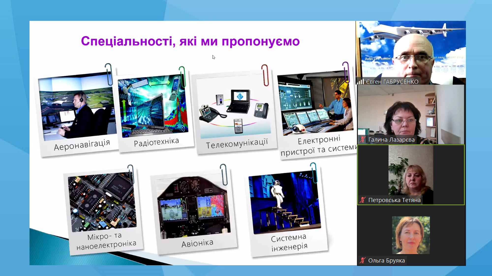 Модератор профорієнтаційного заходу – Петровська Тетяна, к.пед.н., директор Центру допрофесійної підготовки та обдарованої учнівської молоді ННІРО НАУ. Інформаційне забезпечення здійснювала Бруяка Ольга, к.т.н., доцент, завідувач кафедри базових і спеціальних дисциплін ННІРО НАУ.