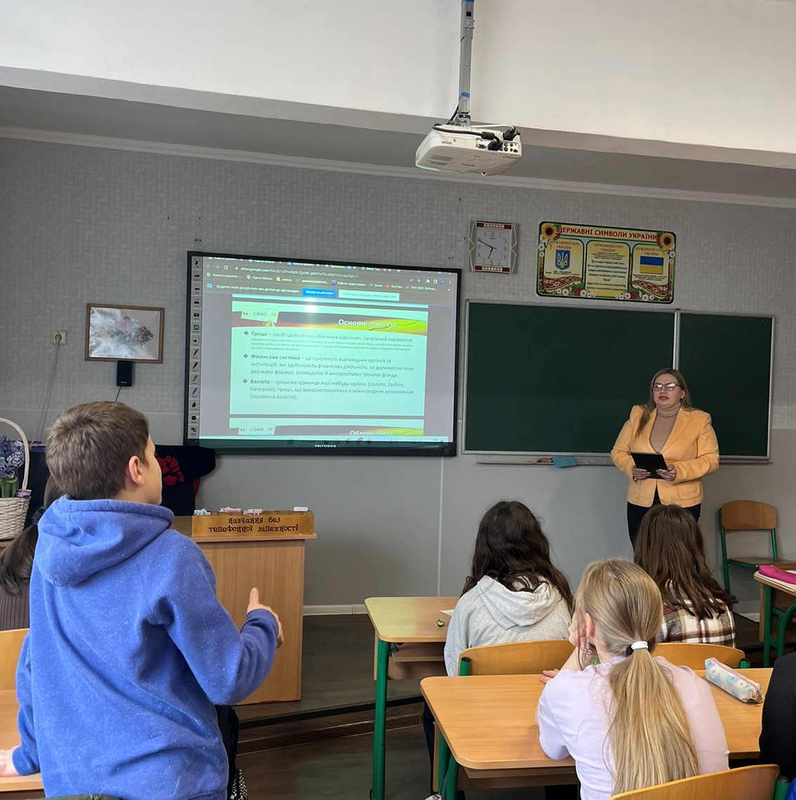 Доповідач– Штик Юлія В`ячеславівна, доцент, доцент кафедри економіки та бізнес-технологій Факультету економіки та бізнес адміністрування НАУ, кандидат економічних наук. За допомогою простих доступних прикладів з повсякденного життя та яскравої презентації Юлія В`ячеславівна розповіла учням про основи фінансової грамотності та про роль грошового обігу в суспільстві.