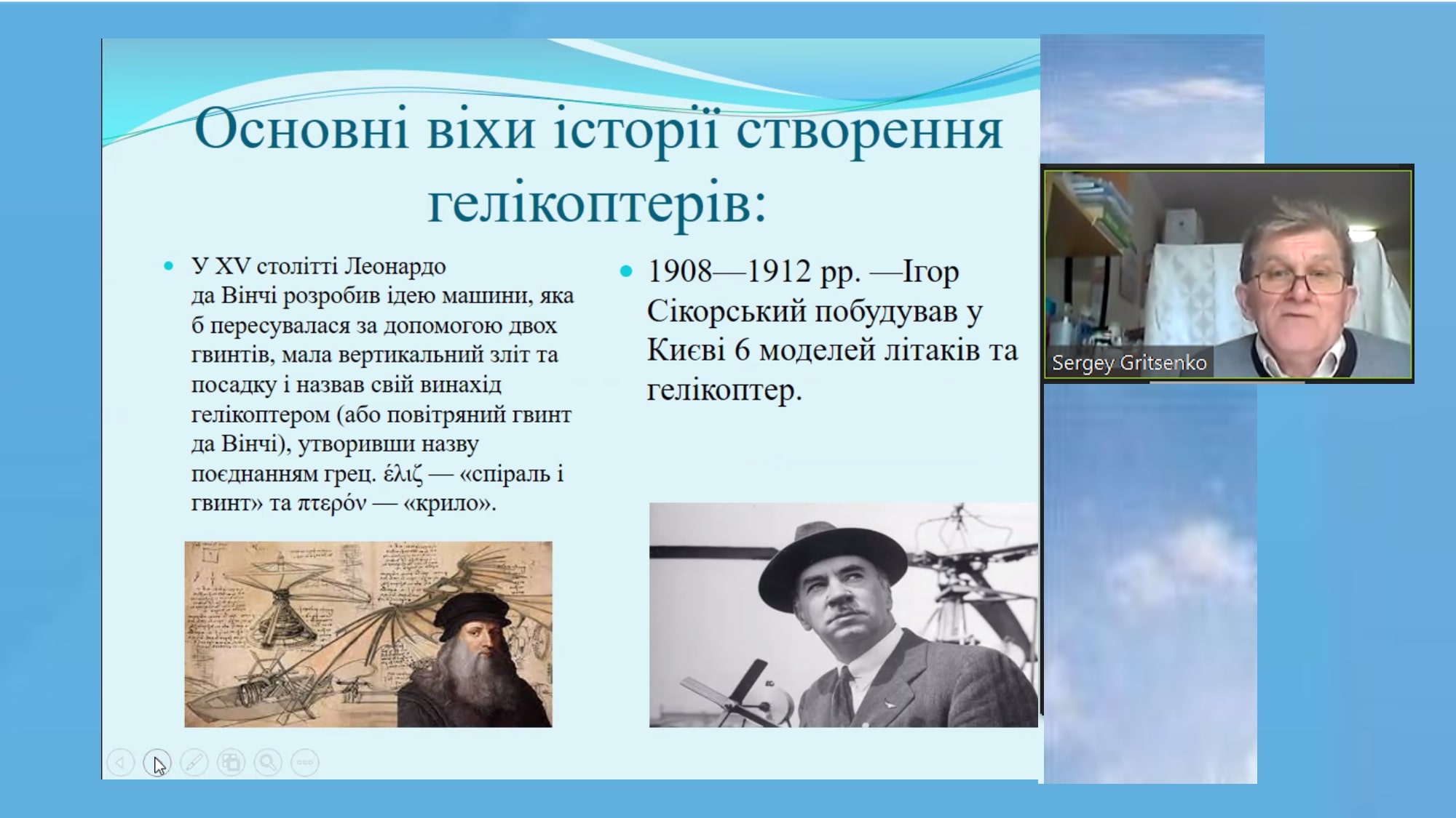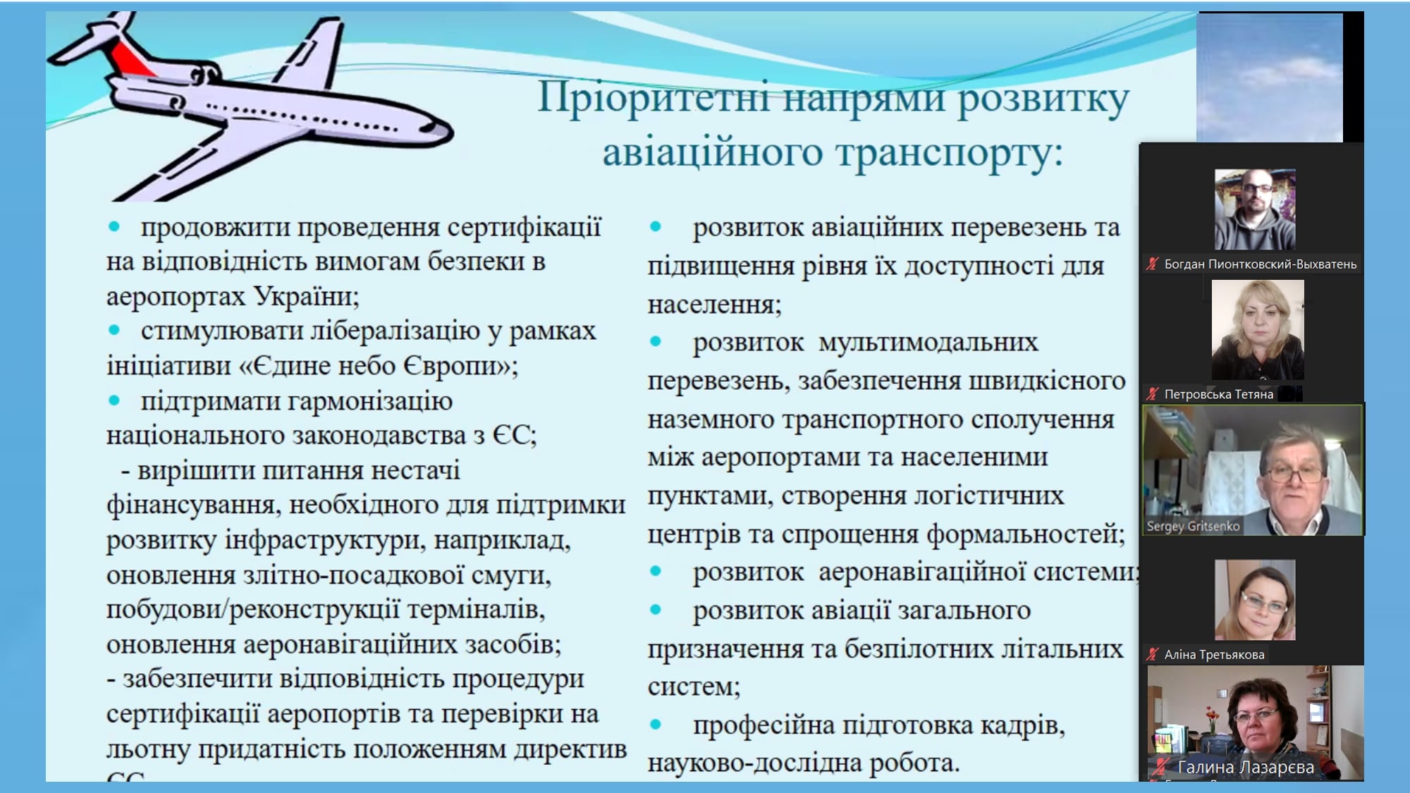 Спікер зустрічі – Гриценко Сергій, професор кафедри логістики Факультету транспорту, менеджменту і логістики НАУ, д.екон.н., професор наголосив, що найбільш значущими сьогодні є дані щодо класифікації, сфер застосування, розробок НАУ на сучасному ринку безпілотних повітряних суден як складової авіатранспортної галузі, а також цілі, завдання, етапи Плану відновлення сфери авіаційного транспорту України.