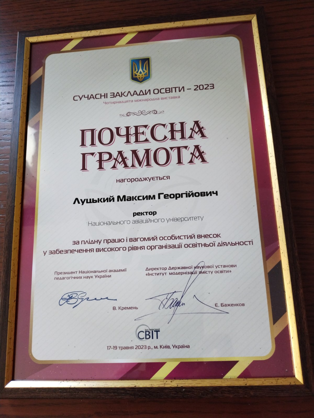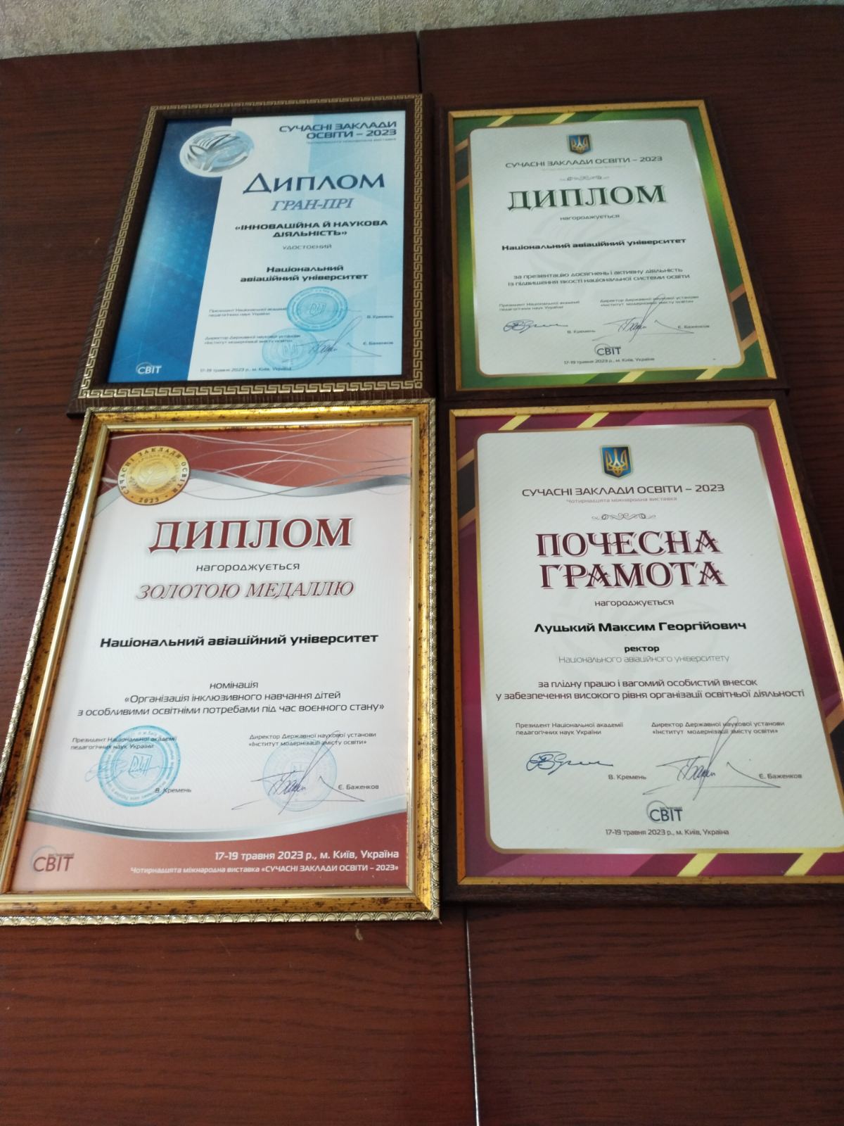 Національний авіаційний університет відзначено у рейтинговому виставковому конкурсі – Гран-Прі «Інноваційна й наукова діяльність»; нагороджено дипломом «За презентацію досягнень і активну діяльність із підвищення якості національної системи освіти»; нагороджено Золотою медаллю у номінації «Організація інклюзивного навчання дітей з особливими потребами під час воєнного стану».