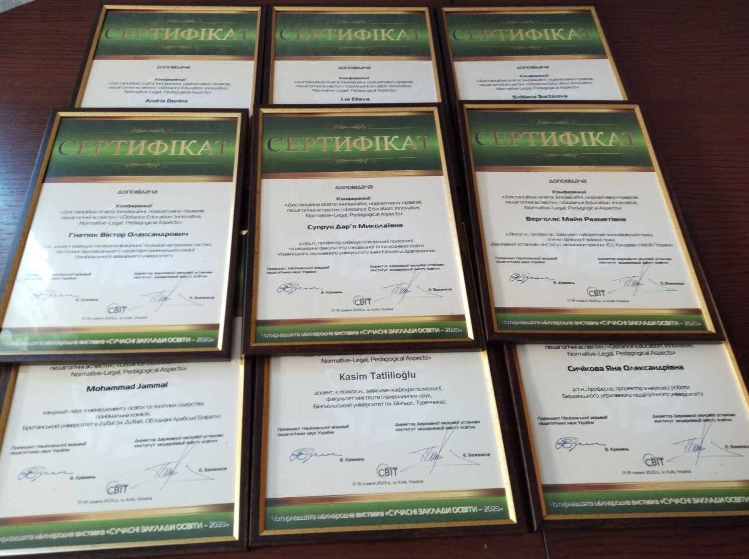 Почесною грамотою нагороджений – Луцький Максим, ректор Національного авіаційного університету, д.тех.н., професор «За плідну працю і вагомий особистий внесок у забезпечення високого рівня організації освітньої діяльності»; сертифікатом автора та Золотою медаллю – Піонтковський-Вихватень Богдан, к.пед.н., психолог Центру допрофесійної підготовки та обдарованої учнівської молоді Навчально-наукового інституту розвитку освіти НАУ за перемогу в конкурсі з тематичної номінації «Організація інклюзивного навчання дітей з особливими освітніми потребами під час воєнного стану». А також нагороджені сертифікатами доповідачів за участь в Міжнародній конференції «Дистанційна освіта: інноваційні, нормативно-правові, педагогічні аспекти» доповідачі – Гнатюк Віктор, к.т.н., доцент, доцент кафедри телекомунікаційних та радіоелектронних систем, заступник відповідального секретаря приймальної комісії НАУ; Аndris Дenins, д.екон.н., професор, Латвійський університет, м.Рига, Латвія; Кasim Тatlilioğlu, доцент, к.псих.н., завідувач кафедри психології, факультет мистецтв і природничих наук, Бінгьольський університет, м. Бінгьол, Туреччина; Mohammad Jammal, к.н. з менеджменту освіти та політики лідерства, Приймальна комісія, Британський університет в Дубаї, м.Дубай, Об'єднані Арабські Емірати; Lia Eliava, к.н. з ділового адміністрування, факультет бізнесу та технологій, Грузинський національний університет SEU, м. Тбілісі, Грузія; Svitlana Suchkovа, к.ф.-м.н., доцент кафедри, Інтегрована старша середня школа та Європейська державна школа в Берліні, м. Берлін, Федеративна Республіка Німеччина; Сичікова Яна, д.т.н., професор, проректор з наукової роботи Бердянського державного педагогічного університету; Верголяс Майя, д.біол.н., професор, завідувач лабораторії психофізіологіі праці, гігієни і фізіології змінної праці, ДУ «Інститут медицини праці ім. Ю.І.Кундієва» НАМН України; Супрун Дар’я, д.пед.н., професор, кафедра спеціальної психології та медицини факультету спеціальної та інклюзивної освіти, Український державний університет ім. М.Драгоманова.