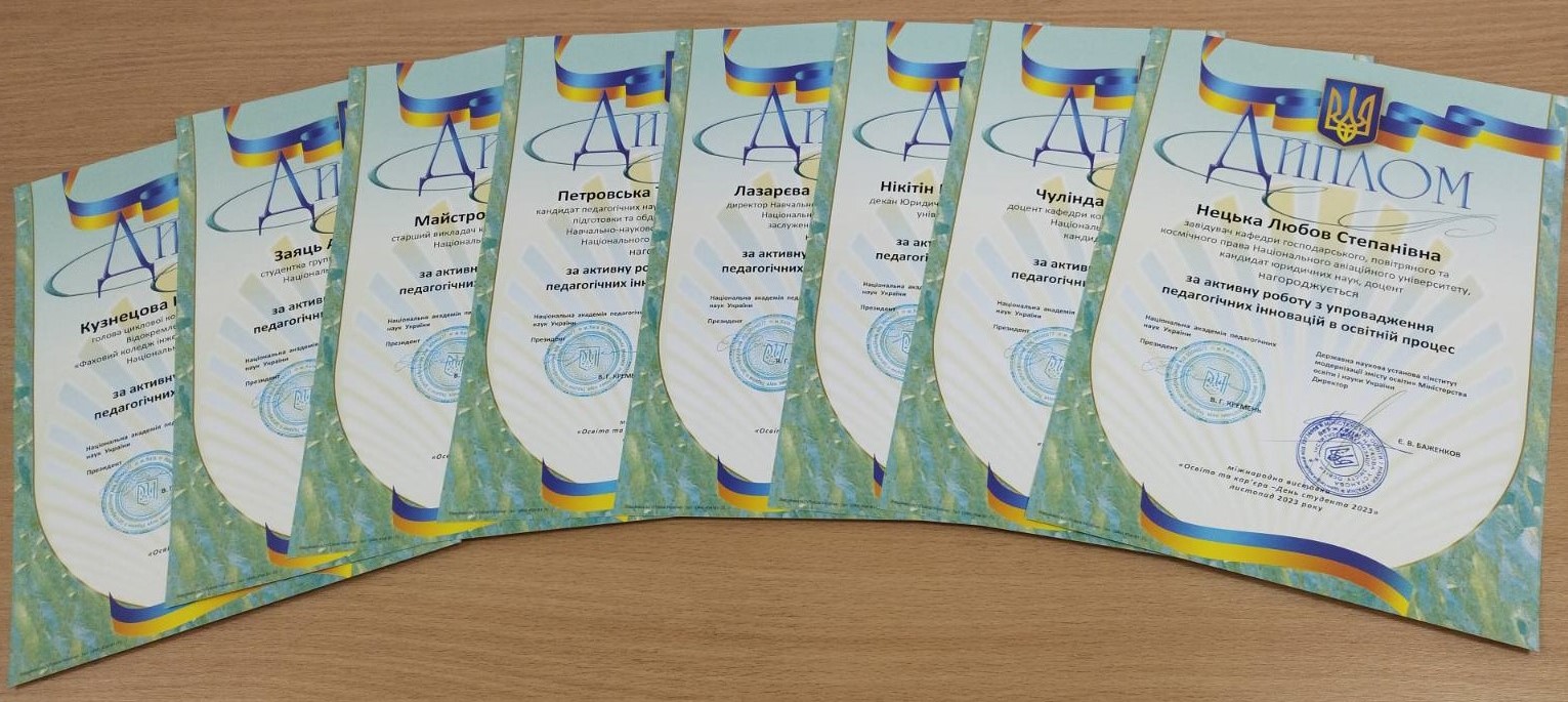 Доповідачі круглого столу «Юриспруденція в сфері авіації», який в онлайн-режимі організував Навчально-науковий інститут розвитку освіти спільно з Юридичним факультетом, відзначені дипломами.