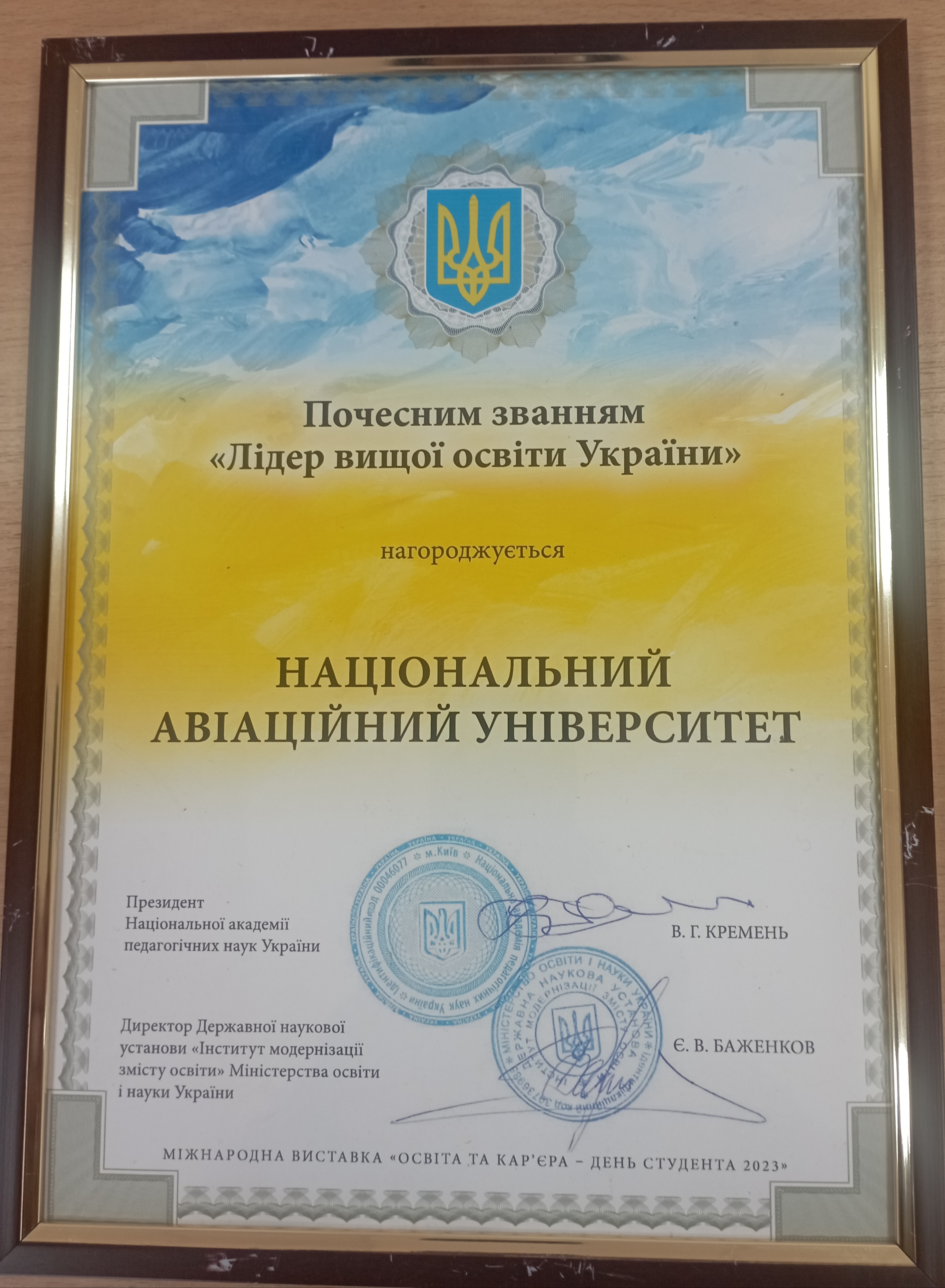 У рейтинговому конкурсі виставки НАУ нагороджено Почесним званням «Лідер вищої освіти України» та Золотою медаллю в номінації «Профорієнтаційна робота серед молоді».