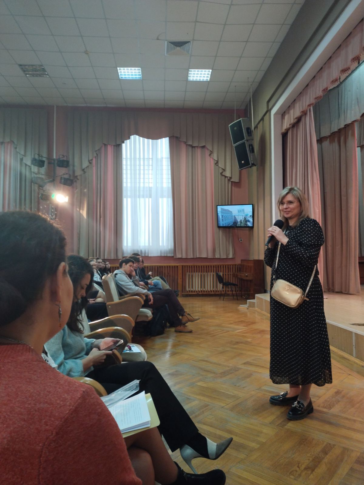 Белуга Юлія, старший викладач кафедри цивільного права і процесу ЮФ НАУ виступила із доповіддю «Захист дітей державою в умовах воєнного стану» і ознайомила учасників із напрямками діяльності Юридичного факультету.