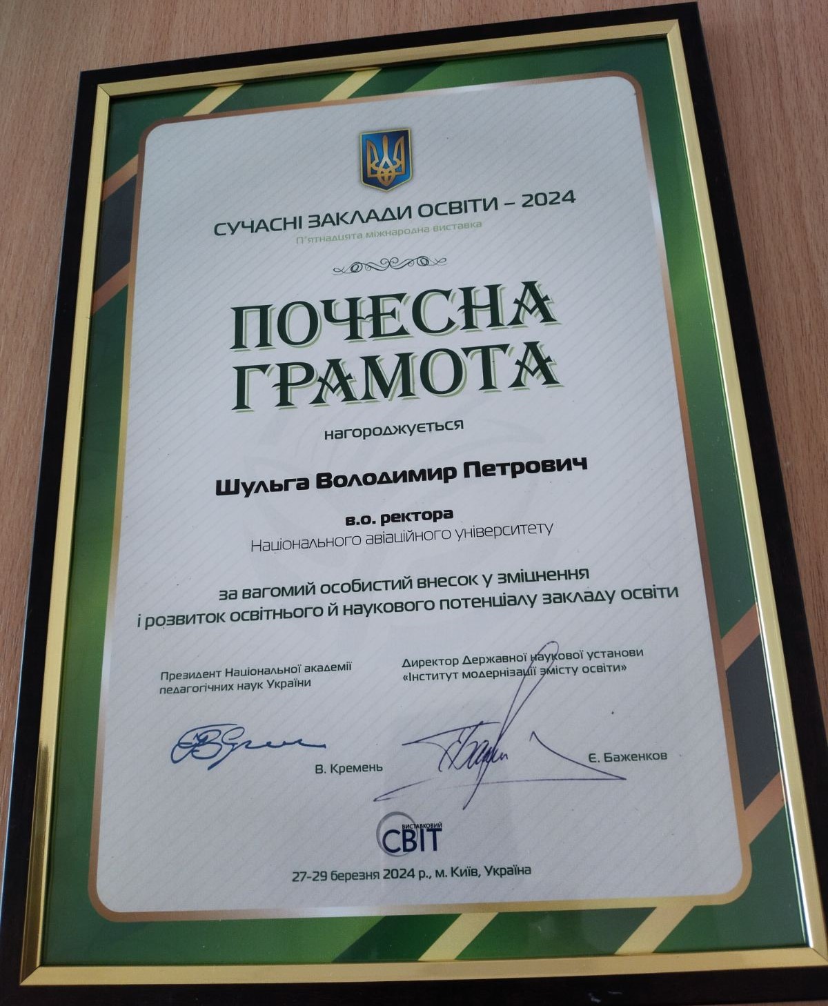 За вагомий особистий внесок у зміцнення і розвиток освітнього й наукового потенціалу закладу освіти Почесною грамотою нагороджено Шульгу Володимира, в.о. ректора НАУ.