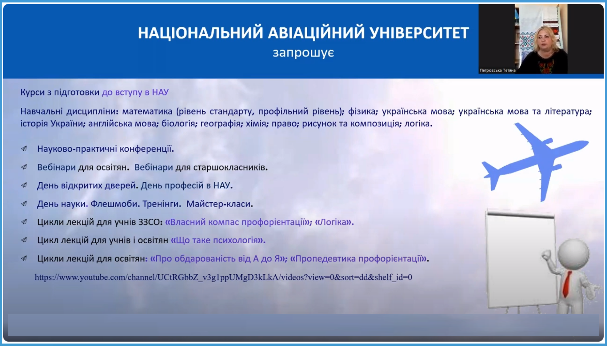Національний авіаційний університет – один із найпотужніших та найвідоміших авіаційних закладів вищої освіти у світі і провідний авіаційний університет в Україні. НАУ, який має славну історію і значні здобутки, протягом 90 років підготував десятки тисяч фахівців зі 122 країн світу і продовжує працювати. Освіта майбутніх абітурієнтів важлива для українського народу, який щоденно героїчно захищає рідну країну! Навчальний процес в університеті забезпечує висококваліфікований науково-педагогічний колектив.