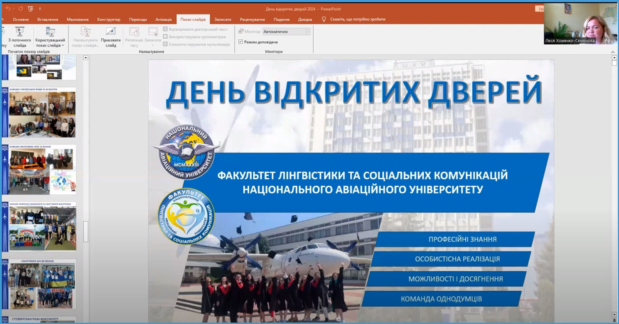 Науково-педагогічні працівники змістовно і цікаво розкрили напрямки діяльності, порядок прийому на навчання, особливості навчання та конкурентні переваги факультетів, англомовні проєкти, детально розповіли про спеціальності, освітні програми, важливі професії, окреслили перспективи подальшого навчання в університеті, розповіли про насичене студентське життя, бази практик і працевлаштування та запросили майбутніх абітурієнтів до вступу в НАУ. Ґрунтовні і яскраві презентації допоможуть майбутнім вступникам НАУ.