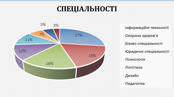 1) спеціальності в галузі IT. Інформаційні технології, такі як програмування та кібербезпека обрали 27 % респондентів;