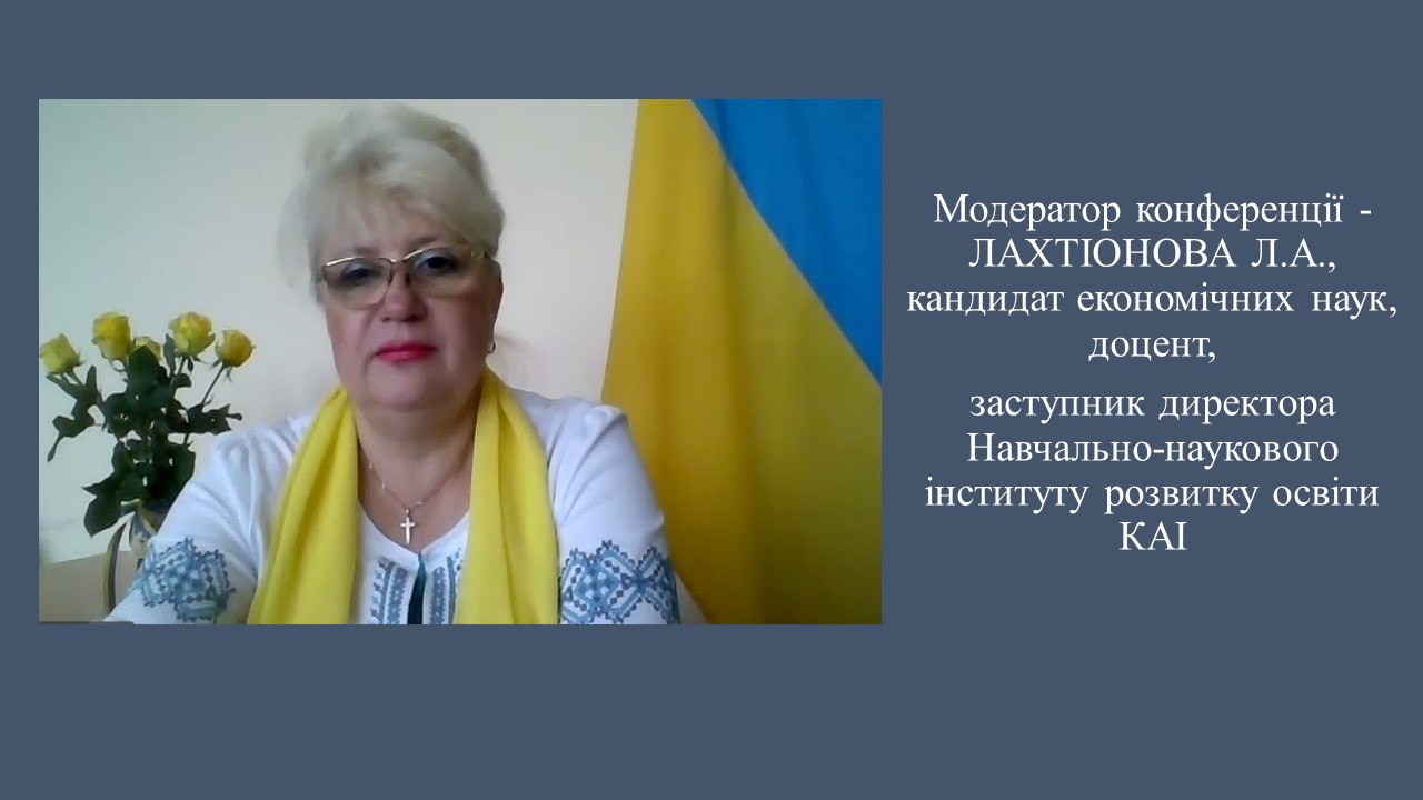 Відкрила конференцію модератор - ЛАХТІОНОВА Л.А., канд. екон. наук, доцент, заступник директора Навчально-наукового інституту розвитку освіти КАІ, яка зауважила, що захід відбувається в умовах тривалої війни, росія продовжує жорстокі військові дії та бомбардування незалежної суверенної української державі.