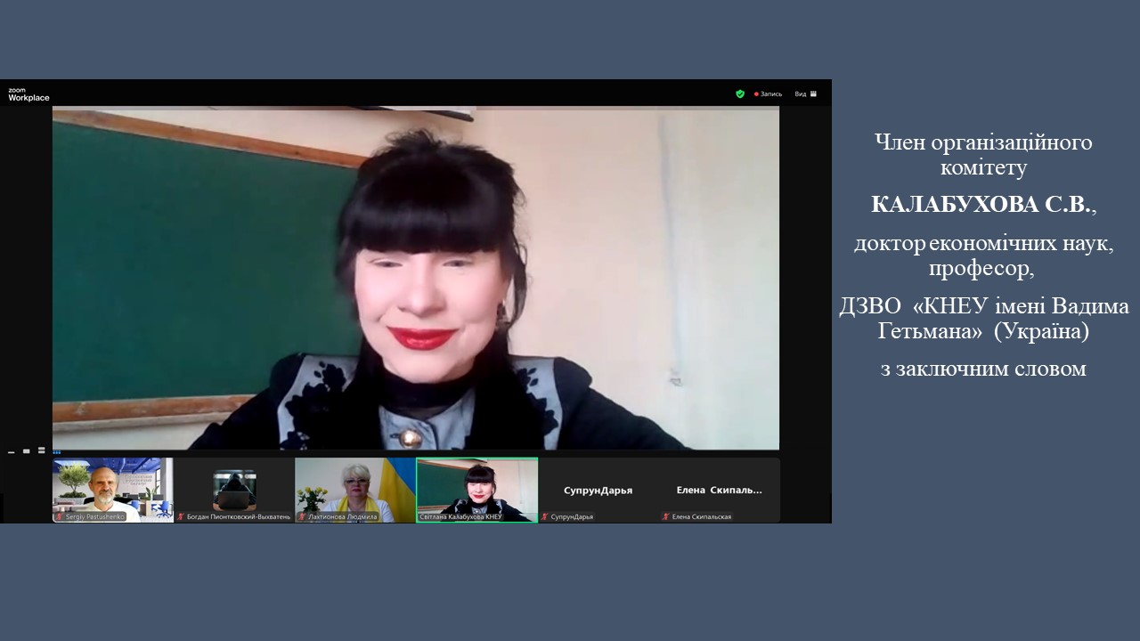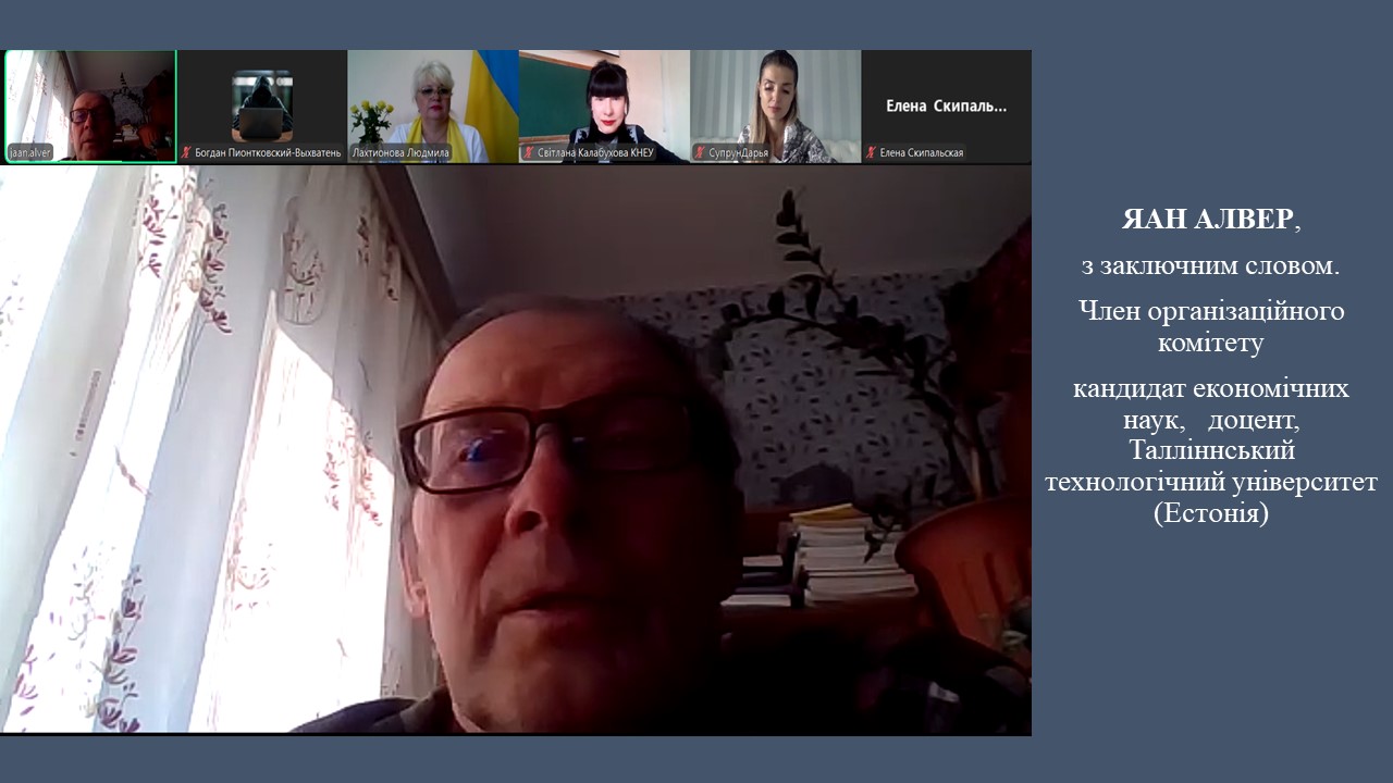 Із заключним словом від організаційного комітету конференції виступили КАЛАБУХОВА С.В., д. екон. наук, професор, ДЗВО «КНЕУ імені Вадима Гетьмана» (Україна) та ЯАН АЛВЕР, канд. екон. наук, доцент, Талліннський технологічний університет (Естонія), які подякували керівництво ДУ «КАІ», в.о. Президента КАІ КСЕНІЮ СЕМЕНОВУ та голову організаційного комітету, проректора з міжнародного розвитку та партнерства КАІ ІРИНУ ЗАРУБІНСЬКУ, дирекцію Навчально-наукового інституту розвитку освіти КАІ за підтримку даної конференції, за запрошення та плідну багаторічну співпрацю.