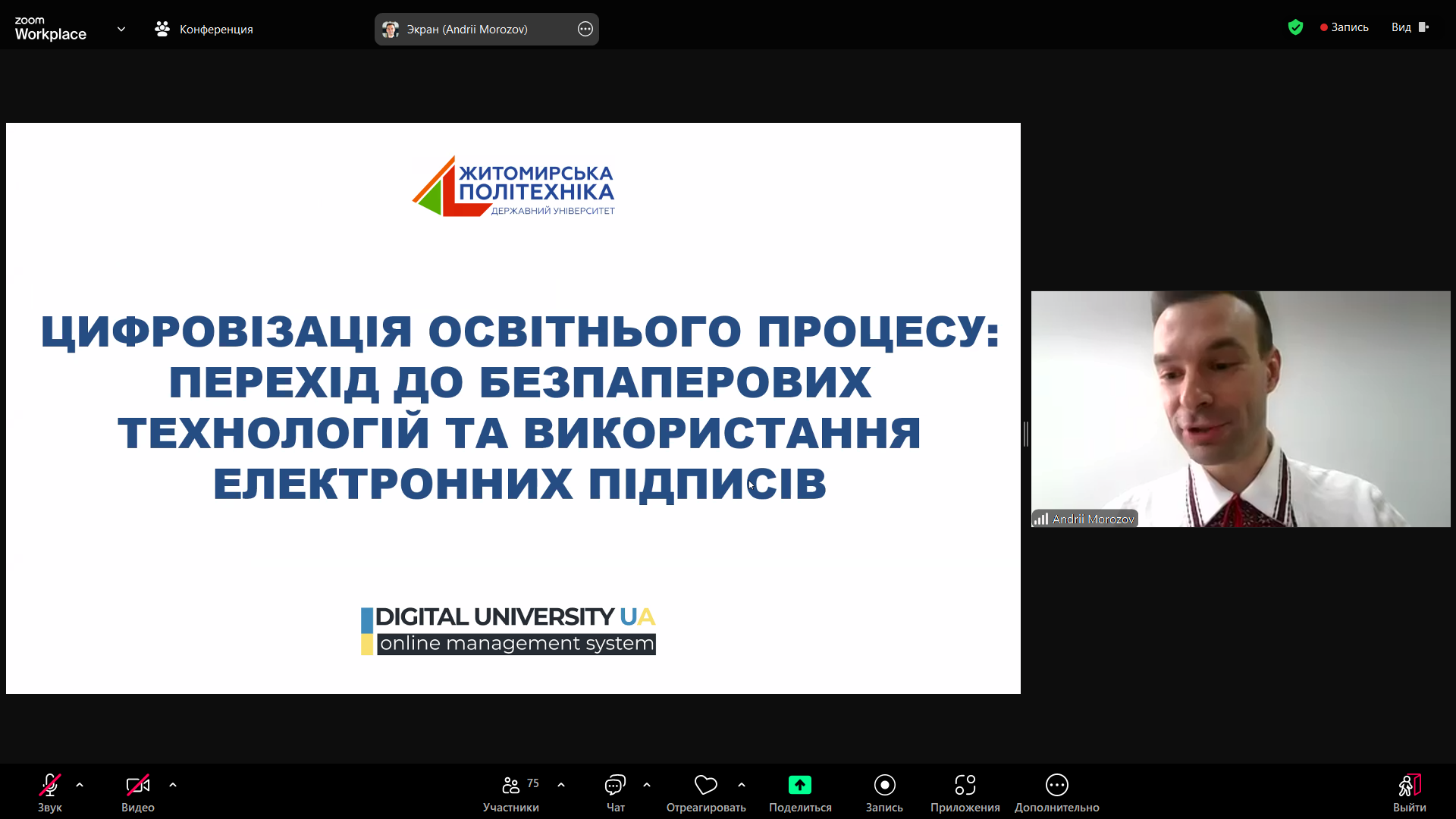 Прикута була увага учасників конференції до виступу МОРОЗОВА А.В., кандидата технічних наук, доцента, проректора з науково-педагогічної роботи Державного університету «Житомирська політехніка» (м. Житомир, Україна) «ЦИФРОВІЗАЦІЯ ОСВІТНЬОГО ПРОЦЕСУ: ПЕРЕХІД ДО БЕЗПАПЕРОВИХ ТЕХНОЛОГІЙ ТА ВИКОРИСТАННЯ ЕЛЕКТРОННИХ ПІДПИСІВ».