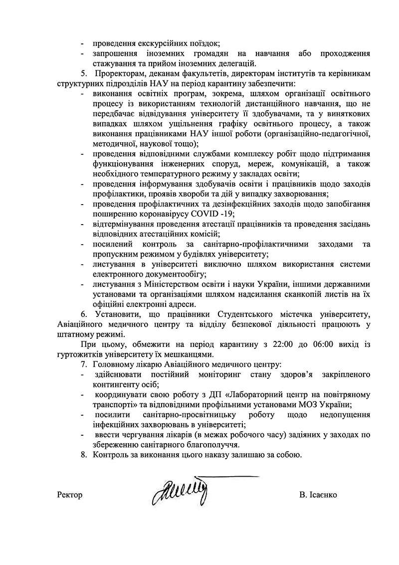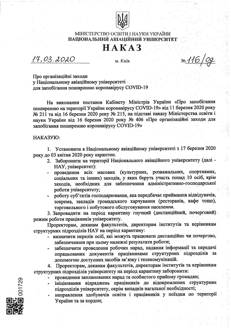 Наказом передбачено установлення карантину у Національному авіаційному університеті з 17 березня по 03 квітня 2020 року.
