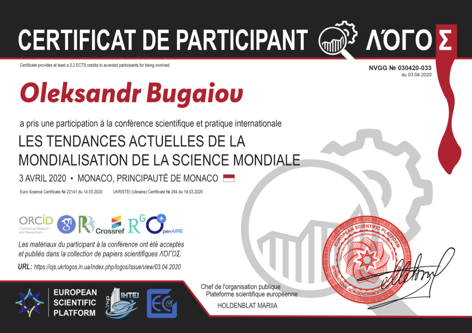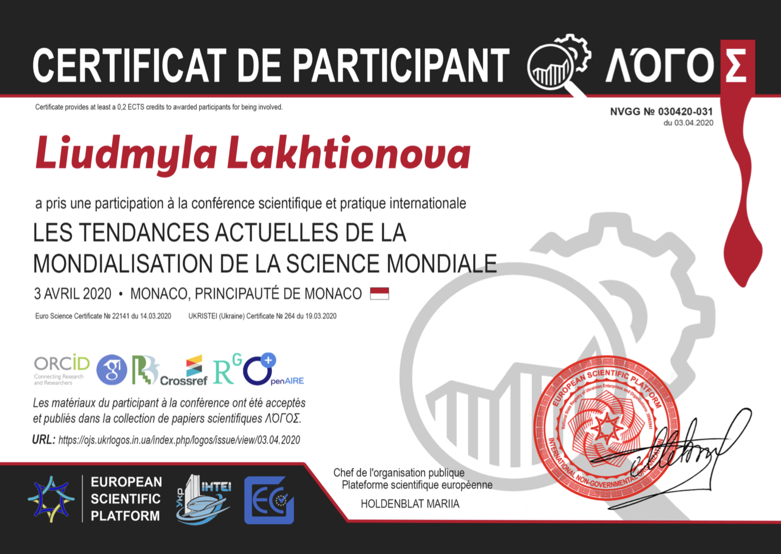 3 квітня 2020 року в Князівстві Монако на онлайн платформі ukrlogos.in.uaвідбулася Міжнародна науково-практична інтернет-конференція «Сучасні тенденції глобалізації світової науки» («Les tendances actuelles de lamondialisation de la science mondiale»).