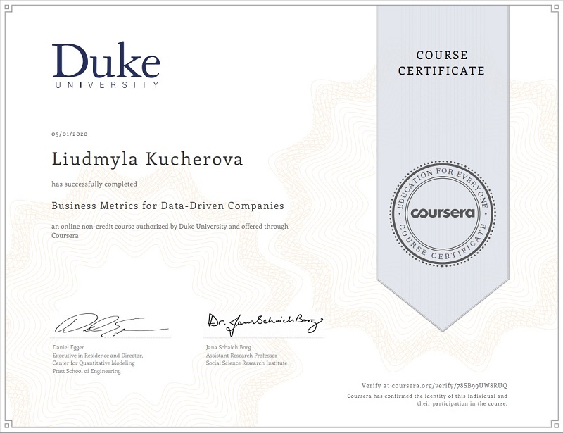 Так, завідувач лабораторії ЕЗДН Людмила Кучерова успішно завершила курс «Business Metrics for Data-Driven Companies» із спеціалізації Excel to MySQL: Analytic Techniques for Business, на якому вивчено кращі практики використання аналітики даних задля підвищення конкурентоспроможності компанії. Курс навчив розпізнавати найважливіші бізнес-показники, отримали чітке уявлення про життєво важливі, але різні ролі бізнес-аналітиків, аналітиків бізнес-даних та науковців із даних у різних компаніях. Використовуючи список із 20 пунктів для оцінки бізнесу, можна оцінити будь-яку компанію задля ефективного використання масиву даних. Цифрові компанії, такі як Amazon, Uber та Airbnb, змінюють цілі галузі, завдяки креативному використанню великих даних. Стало зрозуміло, як ці компанії використовують методи аналізу даних, щоб випереджати інших.