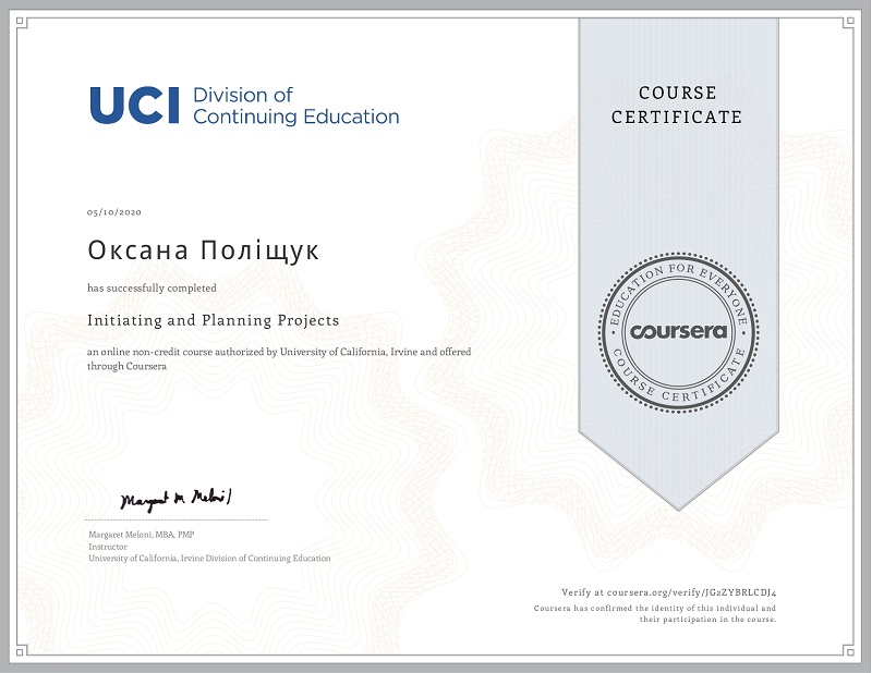 Ініціативу навчання на платформі Coursera підтримала і Оксана Поліщук, заступник директора, доцент. Нею було обрано курс за фахом «Initiating and Planning Projects» представлений University of California, Irvine. У навчальному курсі систематизовано знання в предметній сфері управління проєктами, наведені принципи, методи й інструменти проєктування, а також розглянуто питання планування, контролю, організації, мотивації й координації в рамках проєкту. У курсі розглядаються теоретико-методичні засади управління проєктами, представлено основні відмінності проєкту від поточної діяльності на підприємстві, розглянуто зміст управління проєктами в системі менеджменту організацій, а також обґрунтовано доцільність проєкту та його ефективність, розглянуто організаційні структури управління проєктами тощо.