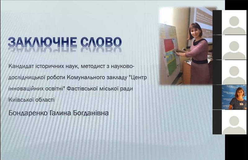 Зі словами подяки керівництву університету, інституту, науковцям виступила кандидат історичних наук, методист з науково-дослідницької роботи Комунального закладу «Центр інноваційних освітні» Фастівської міської ради Київської області Галина Бондаренко.