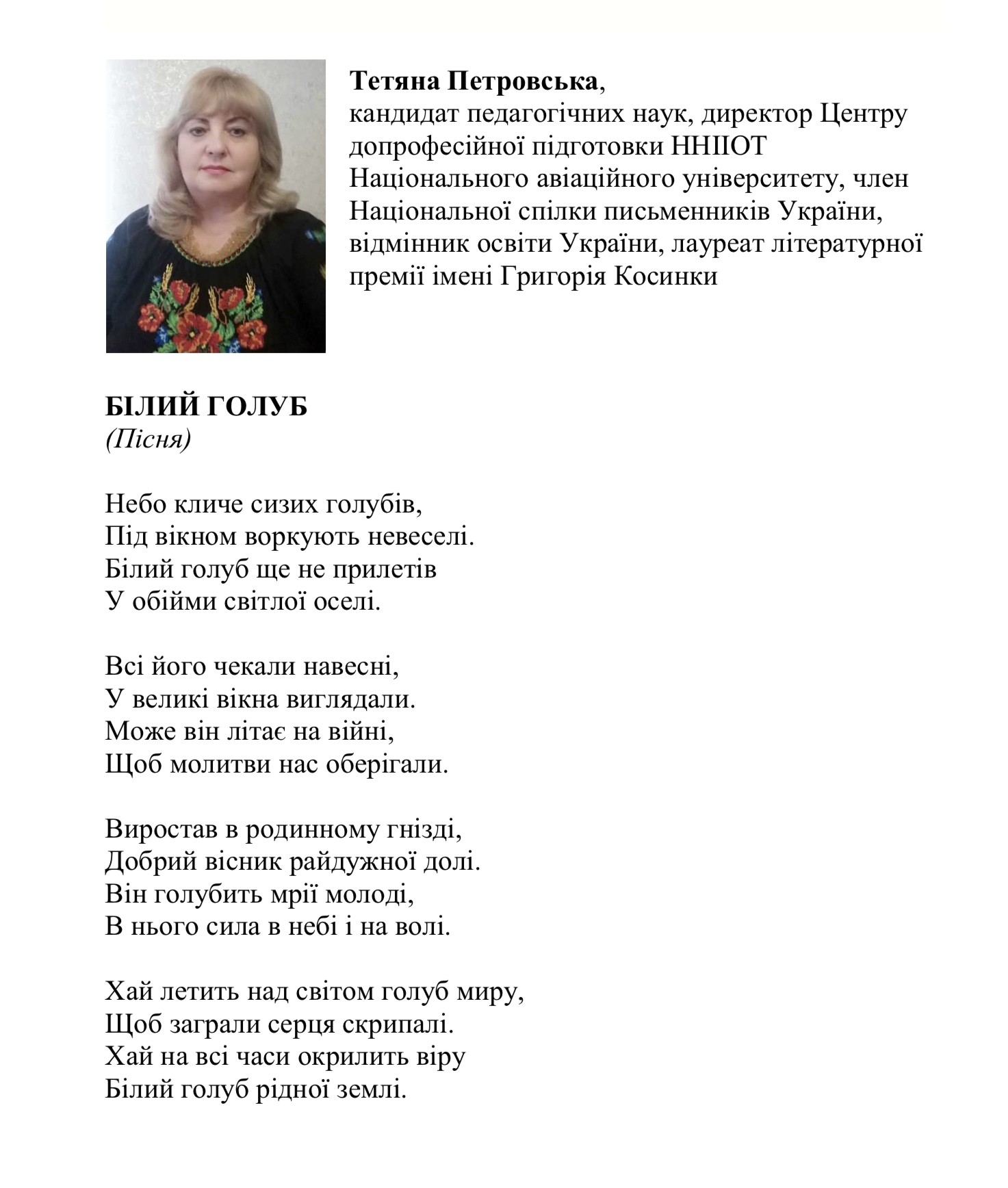 У 2019-2020 навчальному році Навчально-науковий інститут інноваційних освітніх технологій Національного авіаційного університету започаткував Всеукраїнський поетичний конкурс «Білий голуб», який відбувся до Всесвітнього дня книги і авторського права. Конкурс спрямований на підтримку обдарованих учнів і студентів у галузі «Літературна творчість» й творчої праці талановитих педагогів.