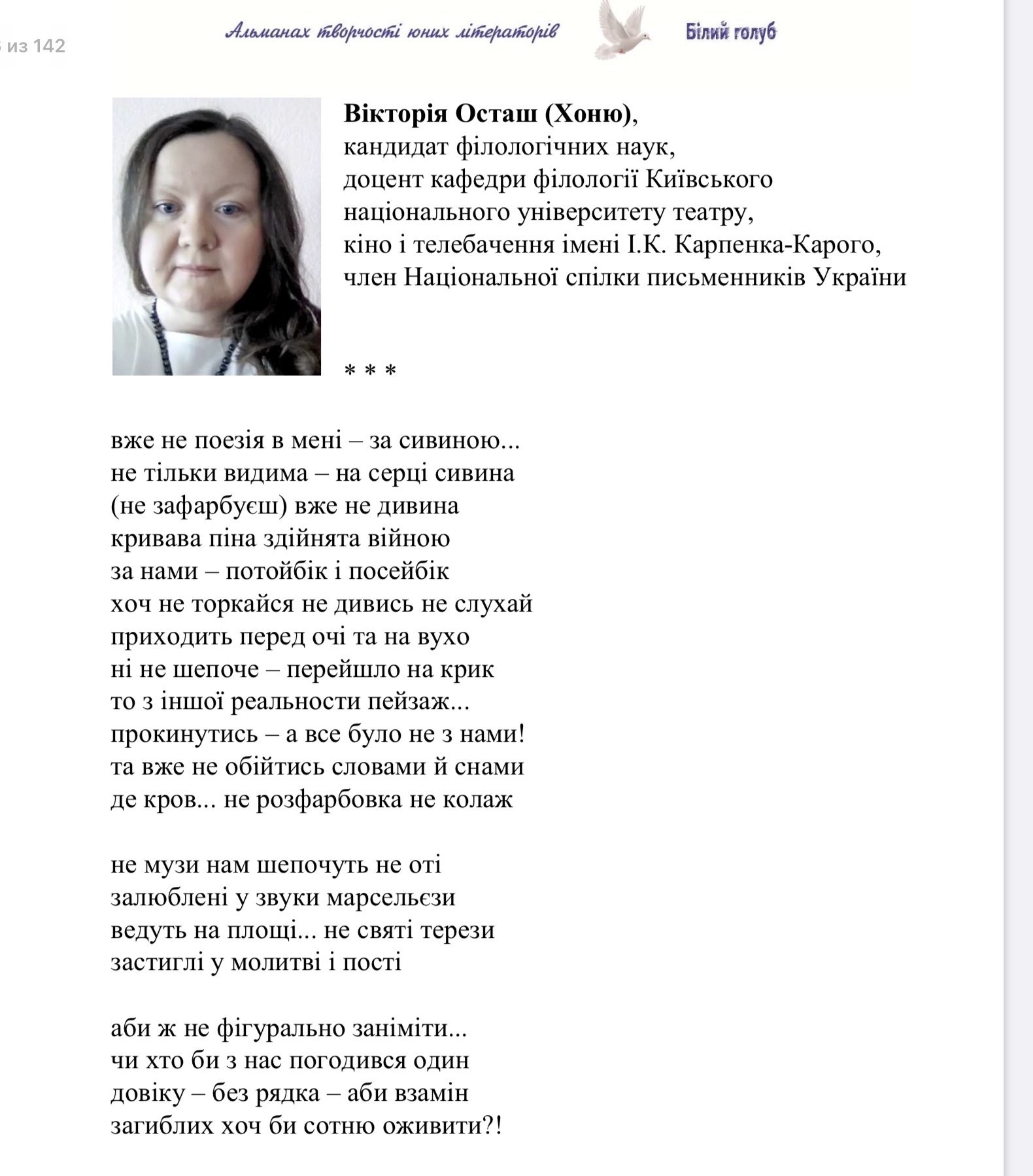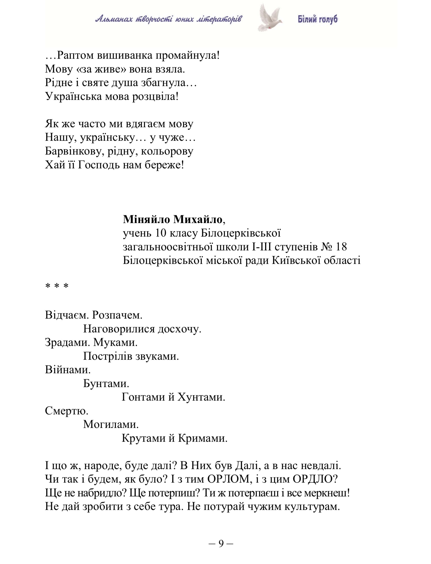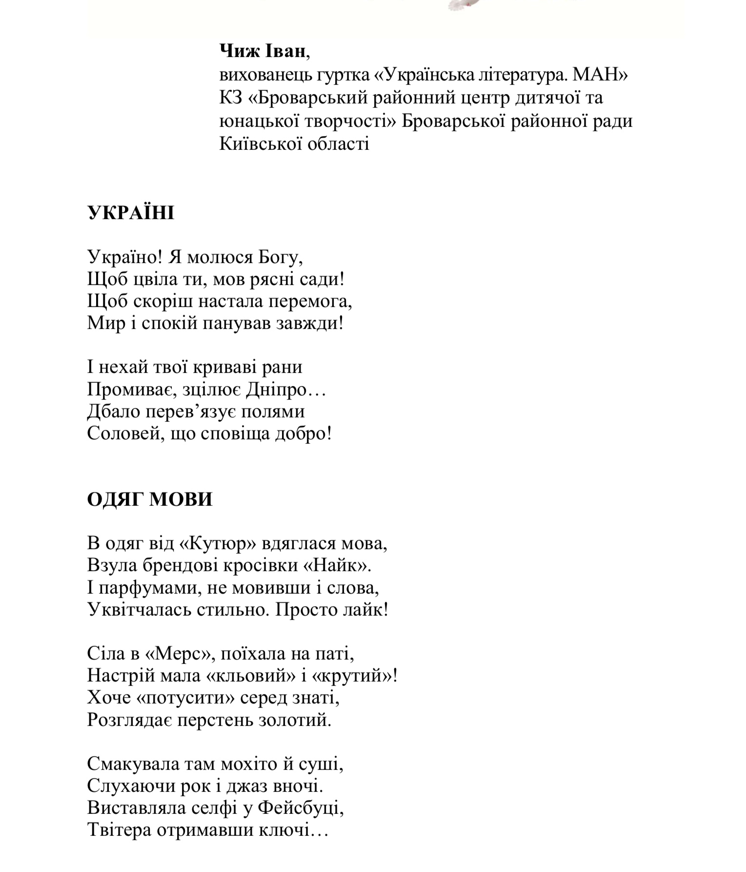 Різноманітний і оригінальний світ поезії завжди привертає увагу великої дитячої та дорослої аудиторії читачів. За результатами конкурсу вийшов електронний варіант альманаху юних літераторів «Білий голуб». Любов до України стала лейтмотивом книжки. Історичне минуле, непросте сьогодення і світле майбутнє червоною ниткою пройшли через основні напрями конкурсу: літературна творчість і духовність особистості, зв’язок літературної творчості з долею українського народу та рідного краю.