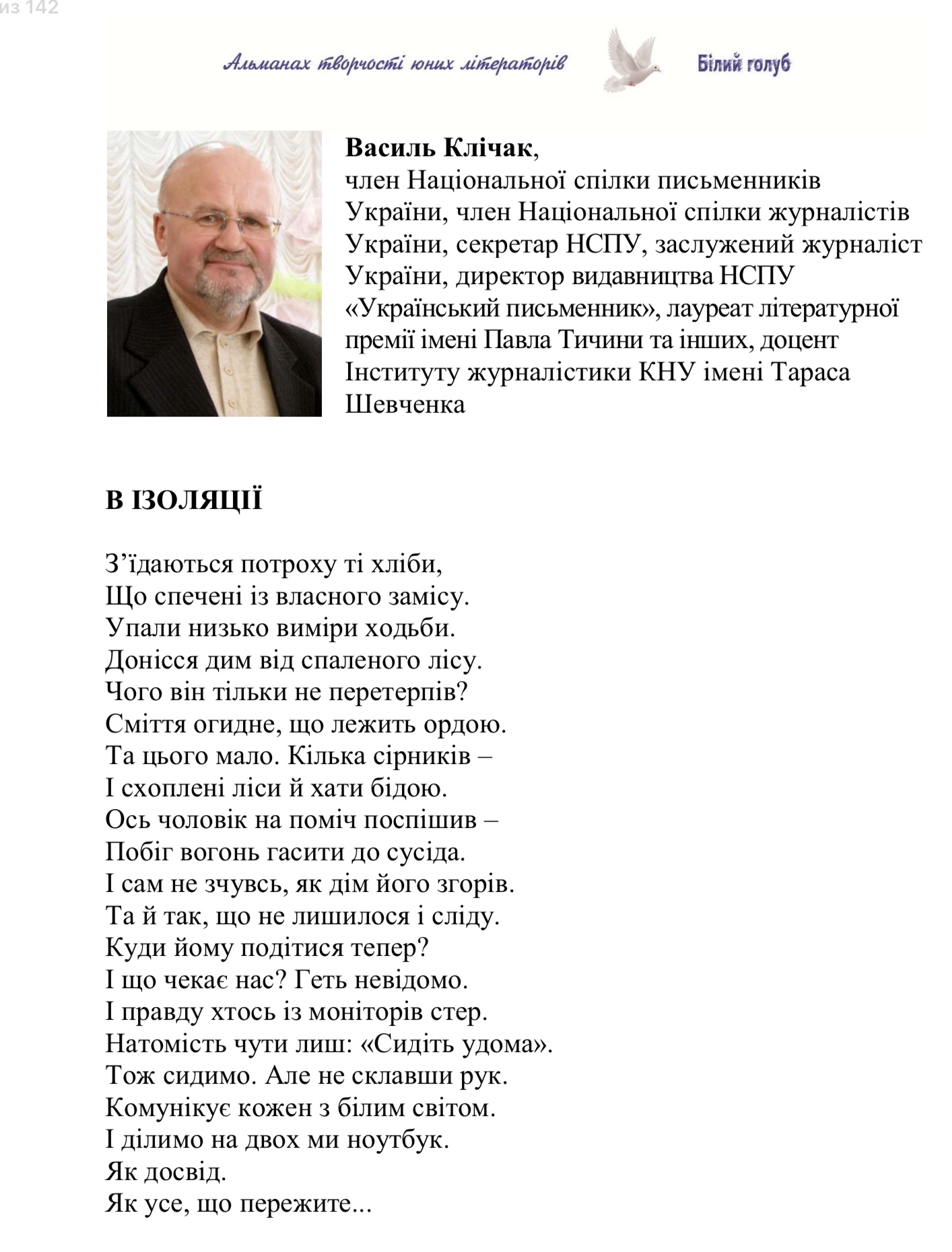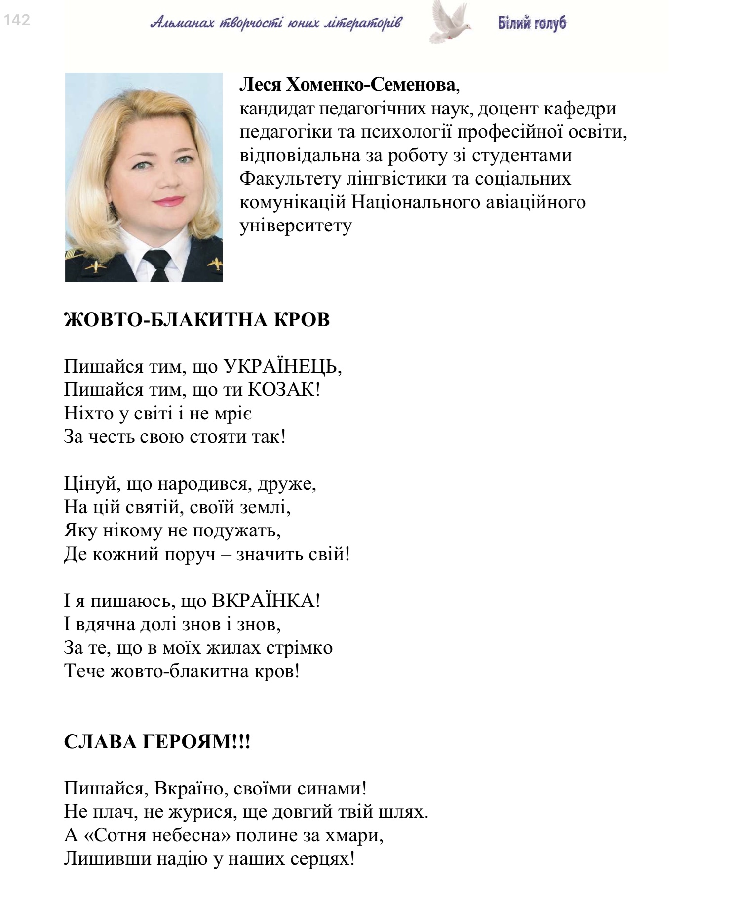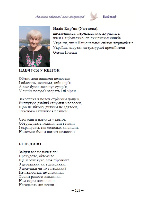 Творчий порив юних талантів і обдарувань надихає, звеличує та окриляє. Сподіваємося, що поетичний збірник «Білий голуб» не залишить байдужих, подарує естетичну насолодуі додасть всім читачам життєвої наснаги та творчого натхнення на славу Вітчизни.