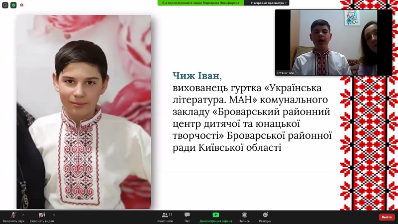 Окрасою мистецького свята стали музичні подарунки лауреатів міжнародних та всеукраїнських конкурсів Варвари Калініної (випускниці Софіївсько-Борщагівської філії Святопетрівської дитячої школи мистецтв); Остапенка Марка (випускника КПНЗ «Святопетрівська дитяча школа мистецтв»), Владислава Федорчука (вихованця дитячого хору «Сходинки» Софіївсько-Борщагівського НВК Києво-Святошинського району), які незважаючи на карантинні обмеження зробили відеозапис виступів, що надзвичайно гармонійно вплелася у відеоконференцію.