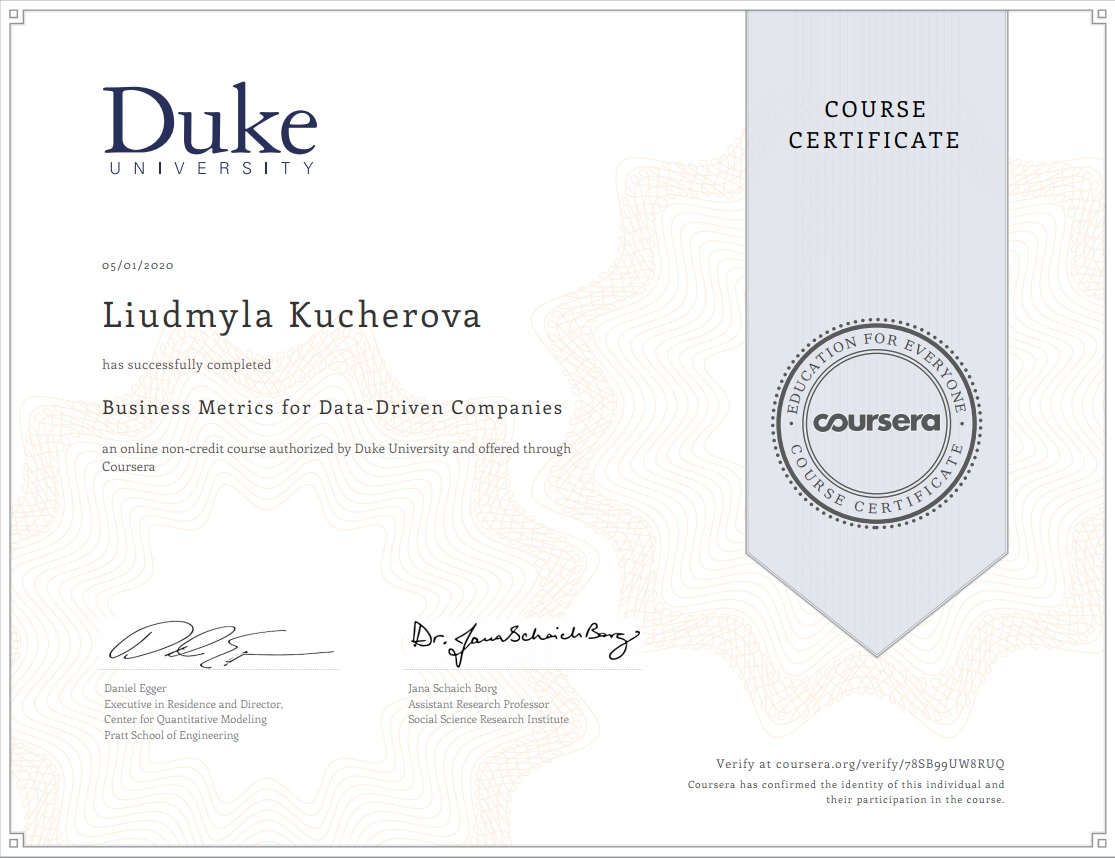 Завідувач лабораторії електронних засобів дистанційного навчання ННІІОТ НАУ Людмила Кучерова успішно закінчила другий курс «Mastering Data Analysis in Excel» («Оволодіння аналізом даних в Excel») зі спеціалізації «Excel to MySQL»: Analytic Techniques for Business» («Від Excel до MySQL: способи аналізу бізнес-даних»). Навчання розраховано на 6 тижнів: Introduction to the Specialization, Binary Classification and the Confusion Matrix, Introduction to Measuring Uncertainty, Introduction to Parametric Models, Concepts Needed for Final Project, Case Study: Modeling Credit Card Default Risk and Customer Profitability.