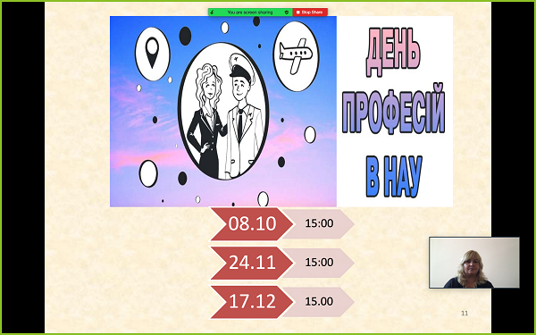 У виступі Тетяна Петровська, к.пед.н., директор Центру допрофесійної підготовки Інституту інноваційних освітніх технологій НАУ подякувала учасникам заходу за співпрацю, активну підтримку та позицію щодо залучення учнів району до наукових, профорієнтаційних та освітніх проєктів, які впроваджує Інститут інноваційних освітніх технологій НАУ. Доповідач представила презентацію «НАУ – твоя мрія!». У презентаційній програмі було висвітлено основні напрями діяльності університету. Особлива увага приділена підготовчим курсам до ЗНО, тренінгам з підготовки до ЗНО та ДПА, пробному ЗНО, Дням науки, науковим школам та Всеукраїнським олімпіадам НАУ. Освітян зацікавили нові проєкти, серед яких «Дні професій в НАУ», вебінари для педагогічних працівників та старшокласників, Всеукраїнський поетичний конкурс «Білий голуб» тощо.