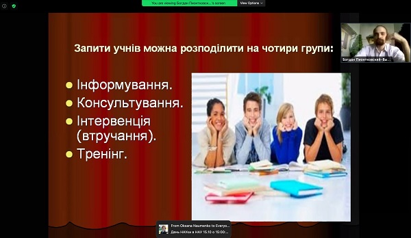 Спікер вебінару – Богдан Піонтковський-Вихватень, кандидат педагогічних наук, психолог-аналітик, груповий психотерапевт, психолог Центру обдарованої учнівської молоді ІІОТ НАУ.