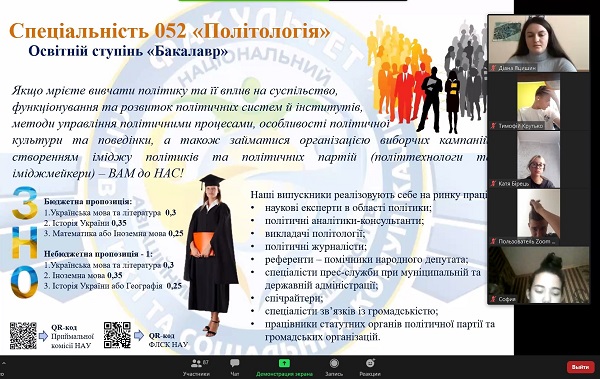 Про сучасні та популярні професії ринку праці перекладач; редактор перекладів; PR-менеджер; бортпровідник; викладач закладу вищої освіти; офісний адміністратор; організатор діловодства; керівник малих підприємств у сфері надання інформації; інспектор; начальник відділу кадрів, канцелярії; виконавчий директор; референт-аналітик; архівіст; директор архіву; зберігач фондів; науковий співробітник; політичний аналітик; викладач політології; референт-помічник депутата; спеціаліст прес-служби; політтехнолог; іміджмейкер; психолог; фахівець із соціального захисту населення майбутнім абітурієнтам розповіли спікери-доценти Леся Хоменко-Семенова, Людмила Доценко, Тетяна Петренко.
