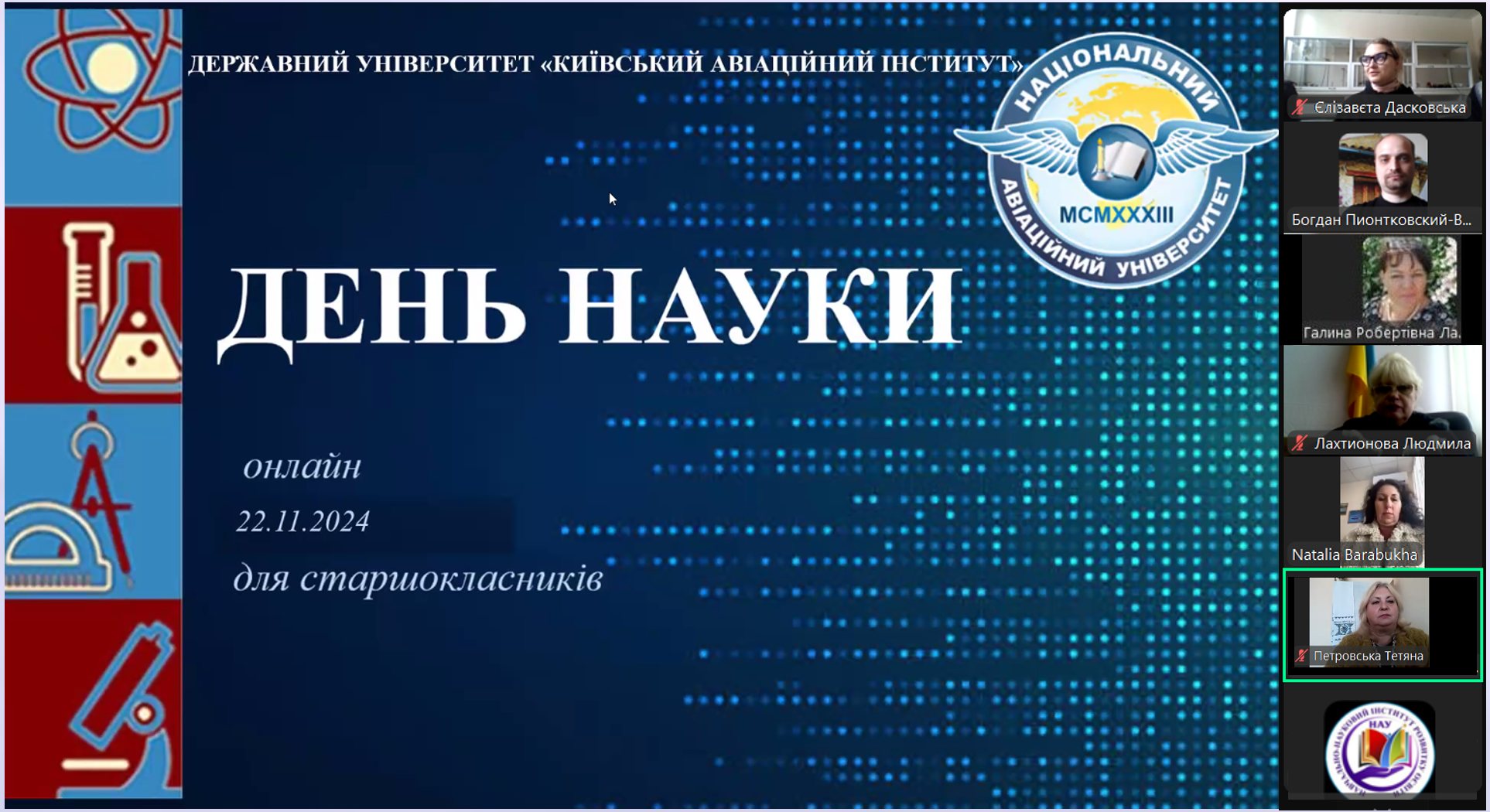 В Державному університеті «Київський авіаційний інститут» відбувся День науки для старшокласників «Сучасні хімічні технології» – 22.11.2024. Організатори дистанційного заходу – Навчально-науковий інститут розвитку освіти, який очолює Галина ЛАЗАРЄВА, заслужений працівник освіти України, спільно з Факультетом екологічної безпеки, інженерії та технології КАІ, в.о. декана Сергій ЗОЗУЛЯ, к.т.н. |