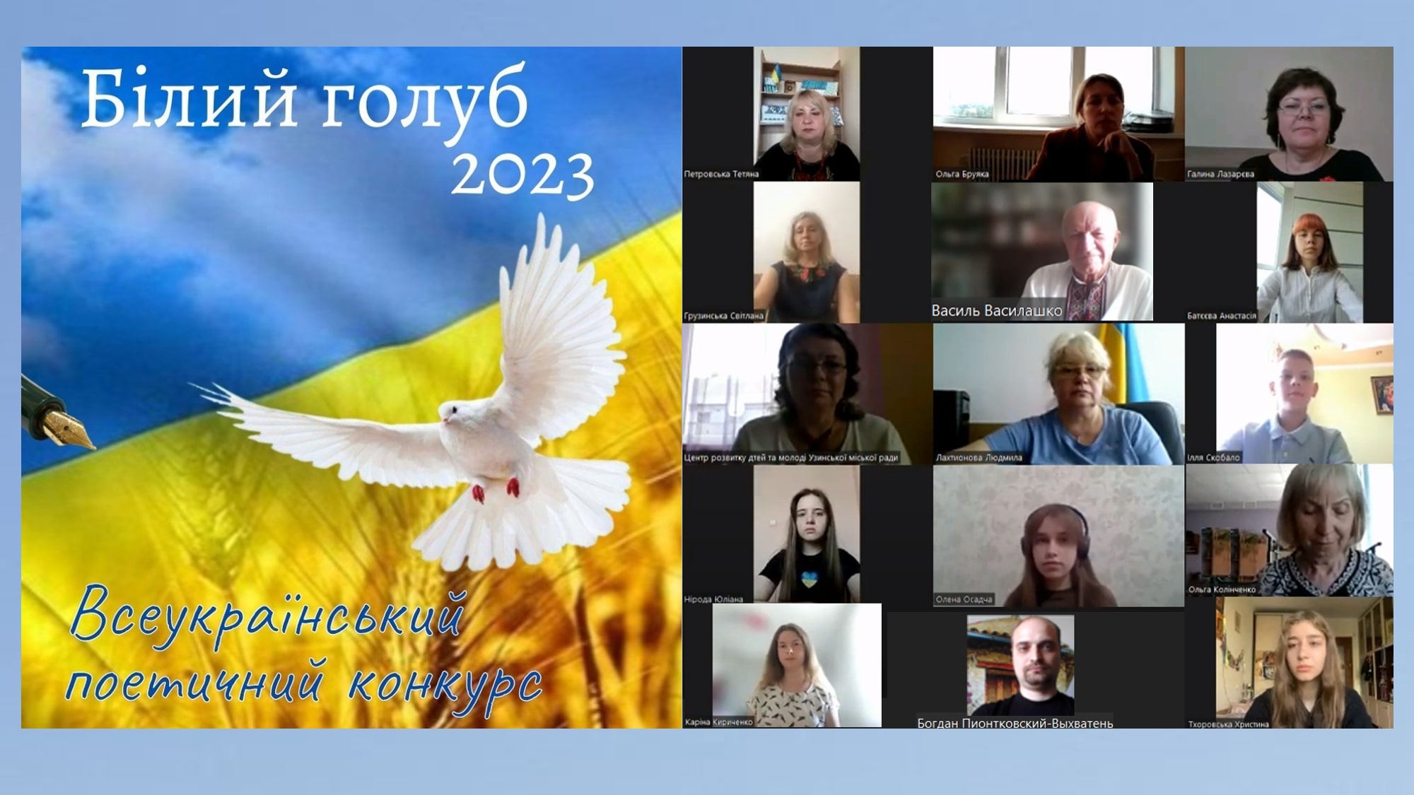 В умовах воєнного стану 21 червня 2023 року в Навчально-науковому інституті розвитку освіти НАУ відбувся захід-онлайн – літературно-мистецьке свято за результатами Всеукраїнського поетичного конкурсу «Білий голуб», в якому взяли участь учні з різних областей України: Волинської, Миколаївської, Дніпропетровської, Київської, Львівської, Тернопільської, Чернігівської, Черкаської, Хмельницької та м. Києва. |