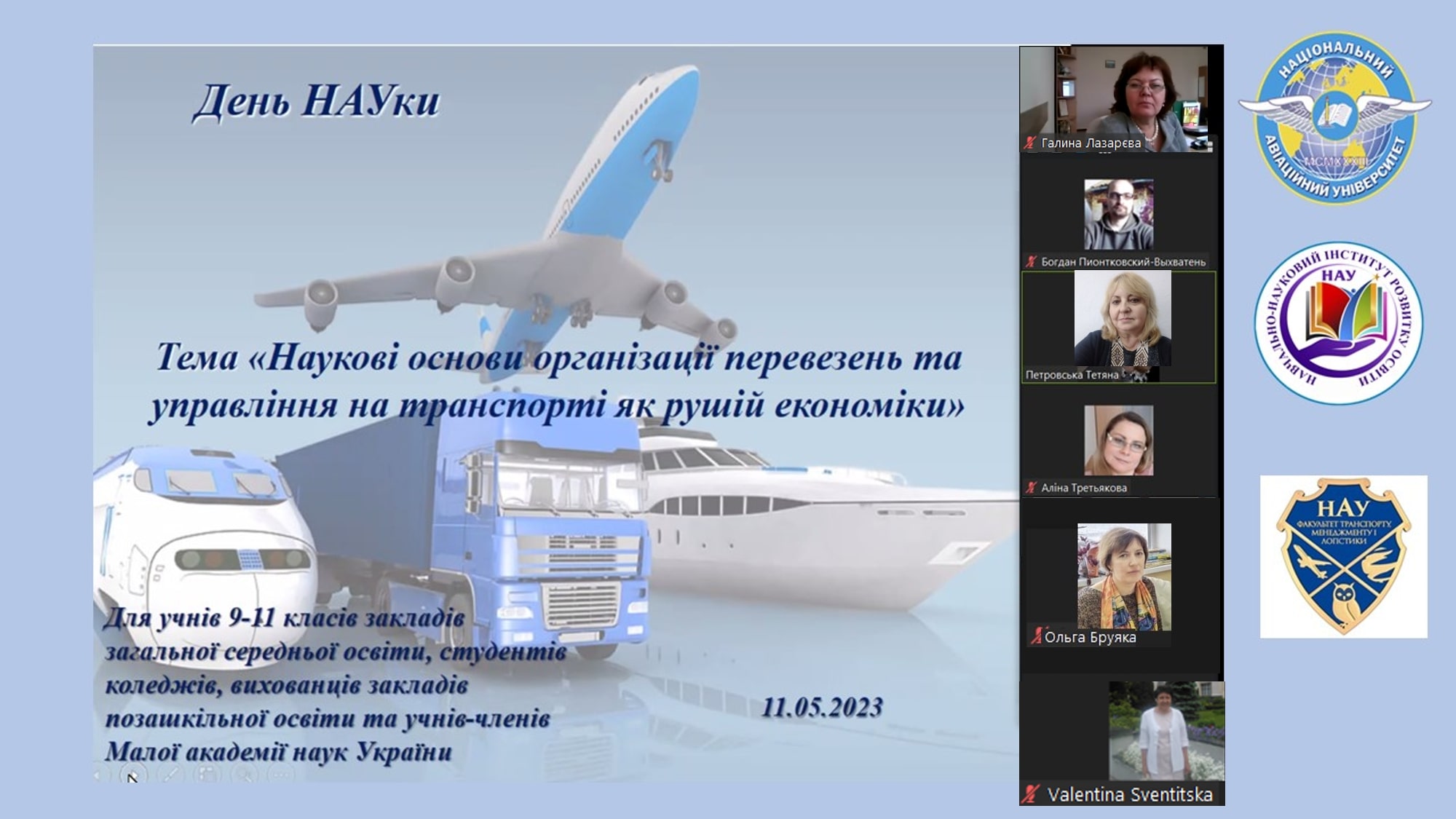 11 травня 2023 року в Національному авіаційному університеті пройшла чергова онлайн-зустріч для учнів 9-11 класів закладів загальної середньої освіти, студентів коледжів, вихованців закладів позашкільної освіти та учнів-членів Малої академії наук України. Організатори: Навчально-науковий інститут розвитку освіти (директор Г.Р.Лазарєва) спільно з Факультетом транспорту, менеджменту і логістики НАУ (декан Т.Л.Мостенська). |