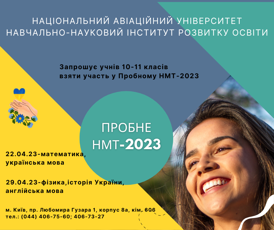 Національний авіаційний університет запрошує учнів 10-11 класів закладів середньої освіти, закладів професійно-технічної освіти, студентів коледжів та випускників минулих років взяти участь у Пробному НМТ–2023! |
