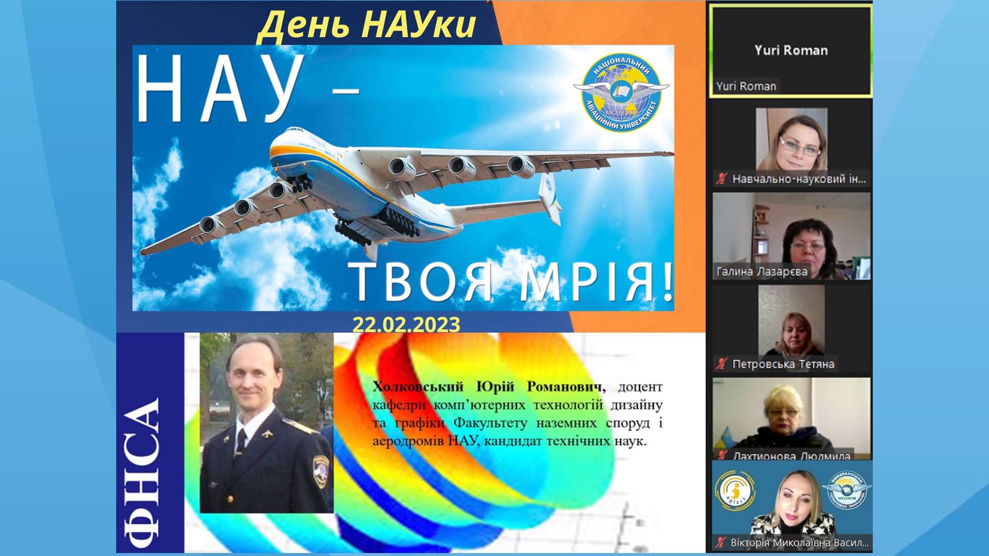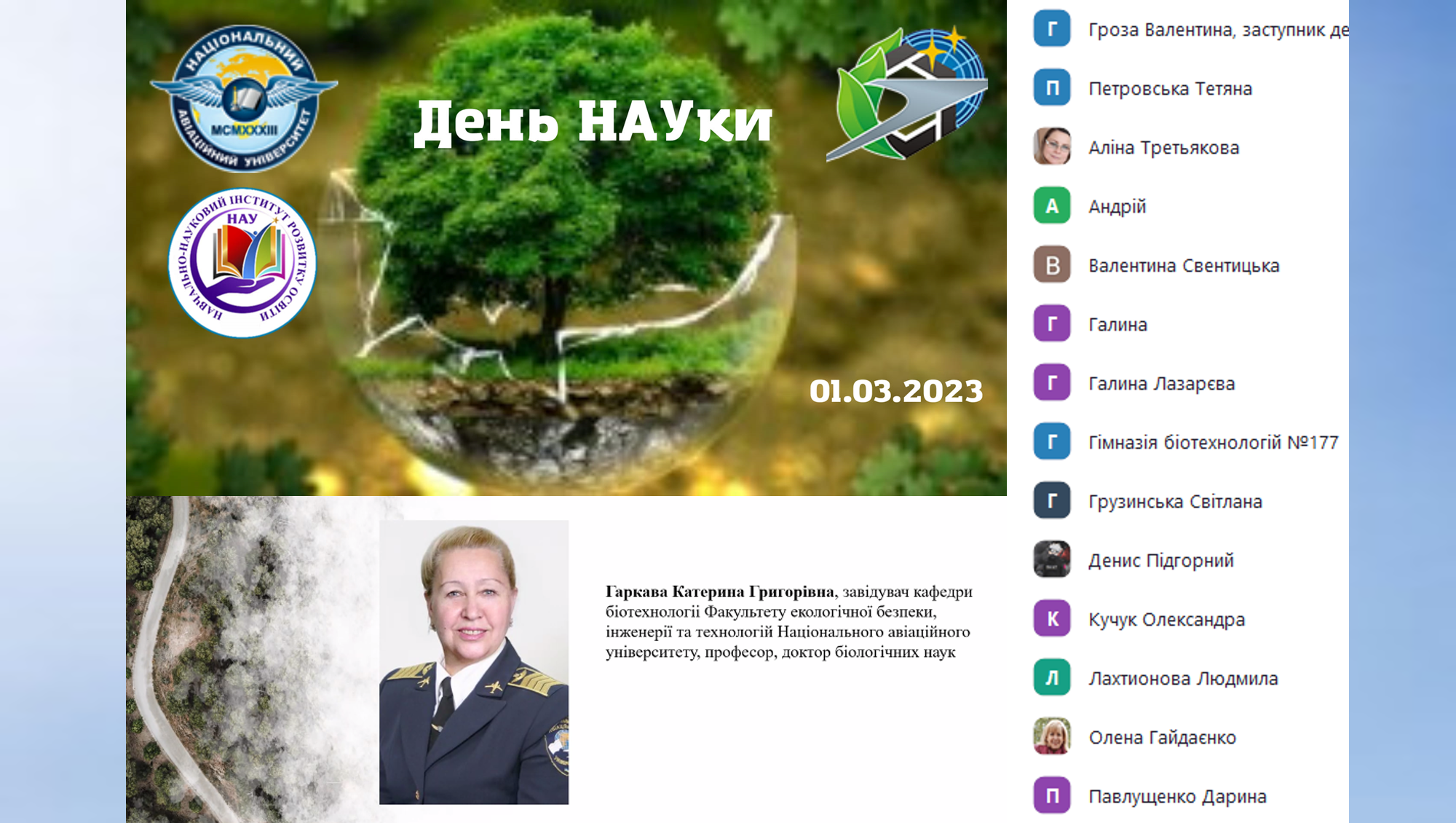 01 березня 2023 року, незважаючи на тривожний період воєнного часу, в Національному авіаційному університеті проведено День НАУки з наукової екологічної школи. Організатори весняної сесії – Навчально-науковий інститут розвитку освіти під керівництвом директора Галини Лазарєвої, заслуженого працівника освіти України, спільно з Факультетом екологічної безпеки, інженерії та технологій НАУ. |