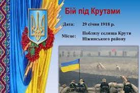 29 січня в Україні відзначається річниця бою під Крутами, який для українського народу став символом героїзму та самопожертви молодого покоління в боротьбі за незалежність. Завдяки героїзму та сміливості українських воїнів ворожий наступ більшовиків на Київ було зупинено на декілька днів. У цей час відбувалися перемовини між Українською Народною Республікою і країнами Четверного союзу. 9 лютого 1918 року Брестський мирний договір було підписано. Він означав визнання самостійної Української Народної Республіки. |