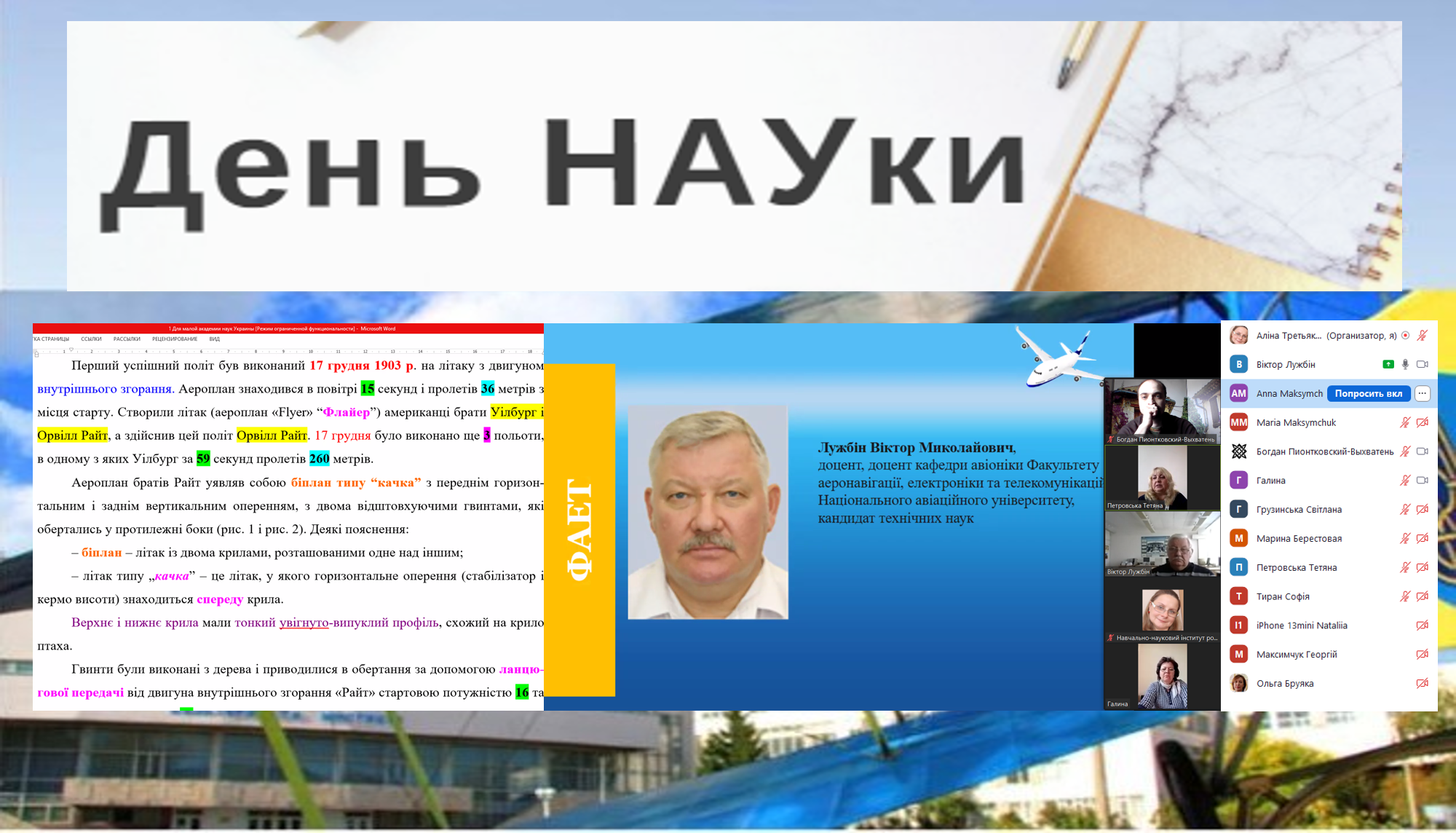 19 жовтня 2022 року в Національному авіаційному університеті відбувся День НАУки для учнів 10-11 класів закладів загальної середньої освіти, студентів коледжів, вихованців закладів позашкільної освіти та учнів-членів Малої академії наук України. Організатори наукової школи – Навчально-науковий інститут розвитку освіти спільно з спільно з Факультетом аеронавігації, електроніки та телекомунікацій НАУ. |